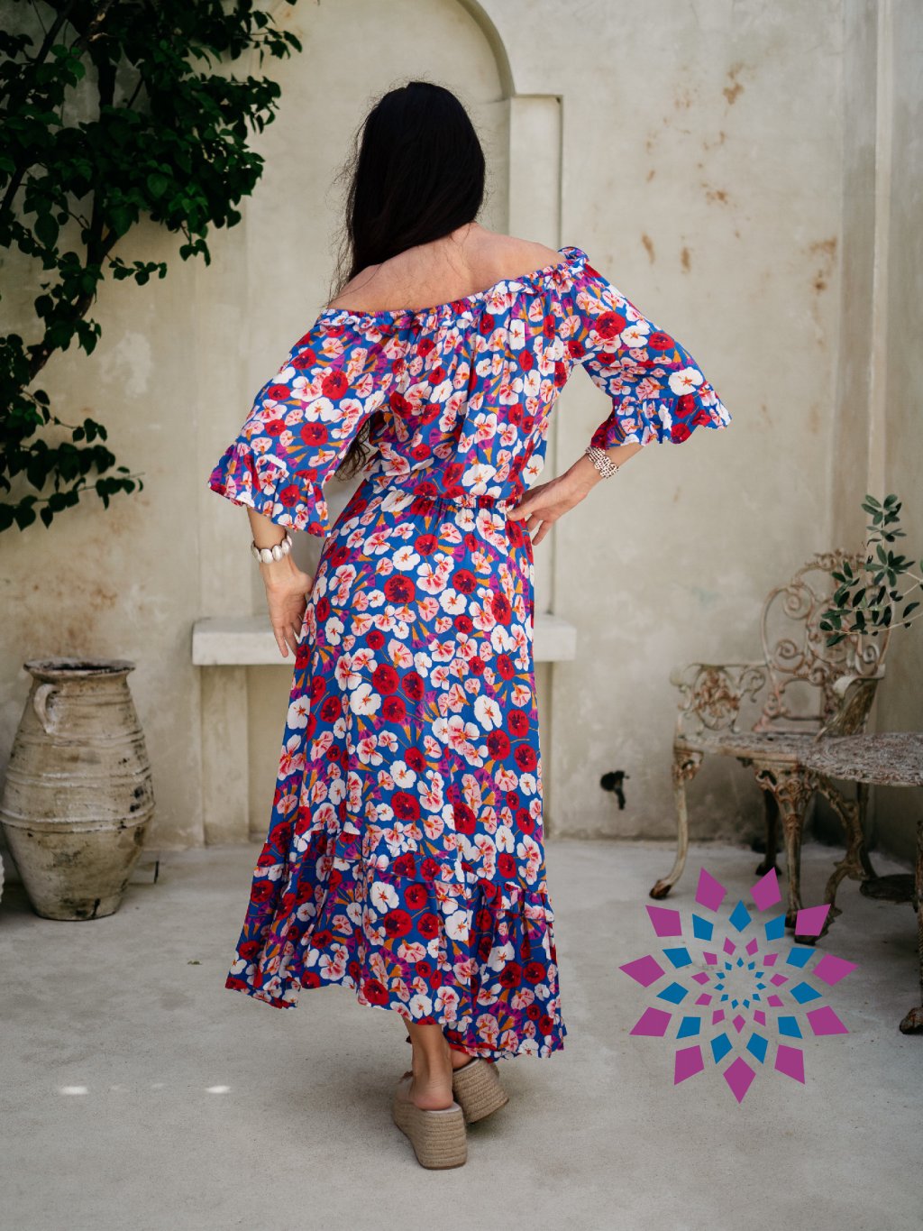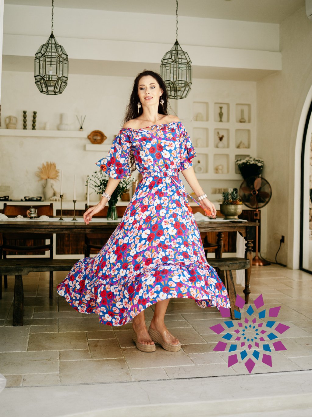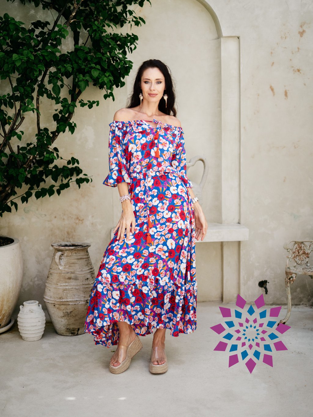 Dlouhé BOHO šaty s 3/4 rukávem, volánkem a ozdobným lemem. Šaty mají kolem ramen elastickou gumu, díky které se dají šaty stáhnout z ramen nebo nechat volně na ramenou. Pod prsy je užší, elastická guma na stahování zakončená barevným střapcem.