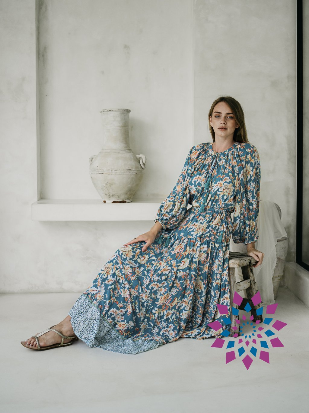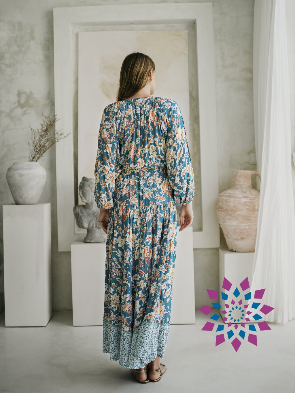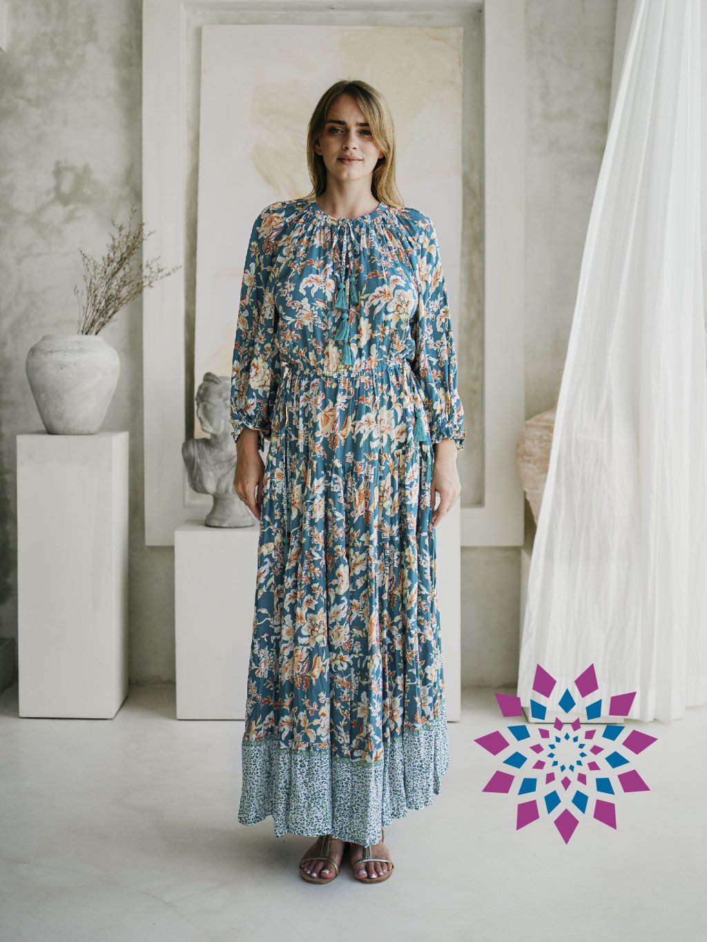 Dlouhé BOHO šaty Velvet jsou velmi elegantní. Mají dlouhý rukáv zakončený gumičkou. Kolem krku jsou šaty na stahování šňůrkou s barevnými střapci. Dlouhá, bohatá sukně je zakončená krásným lemem. V pase je elastická, pružná guma a ozdobné šňůrky se střapci.