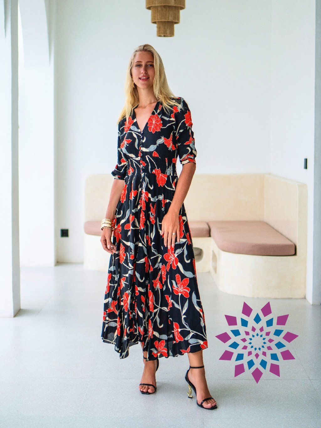 Materiál je 100% viskóza – kvalitní, jemná, na dotek blízká hedvábí. Na těle ji skoro nevnímáš. Střih je vzdušný, s důrazem na pohodlí a ženskou siluetu.