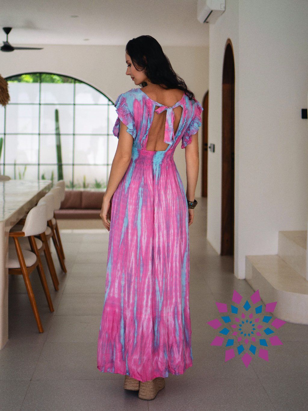 Barva: Růžovotyrkysová. Barvení technikou tie-dye vytváří přechody barev. Každý kus je trochu jiný.