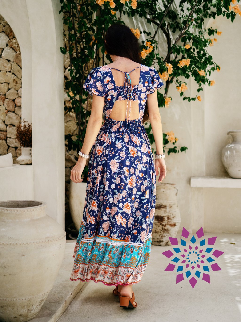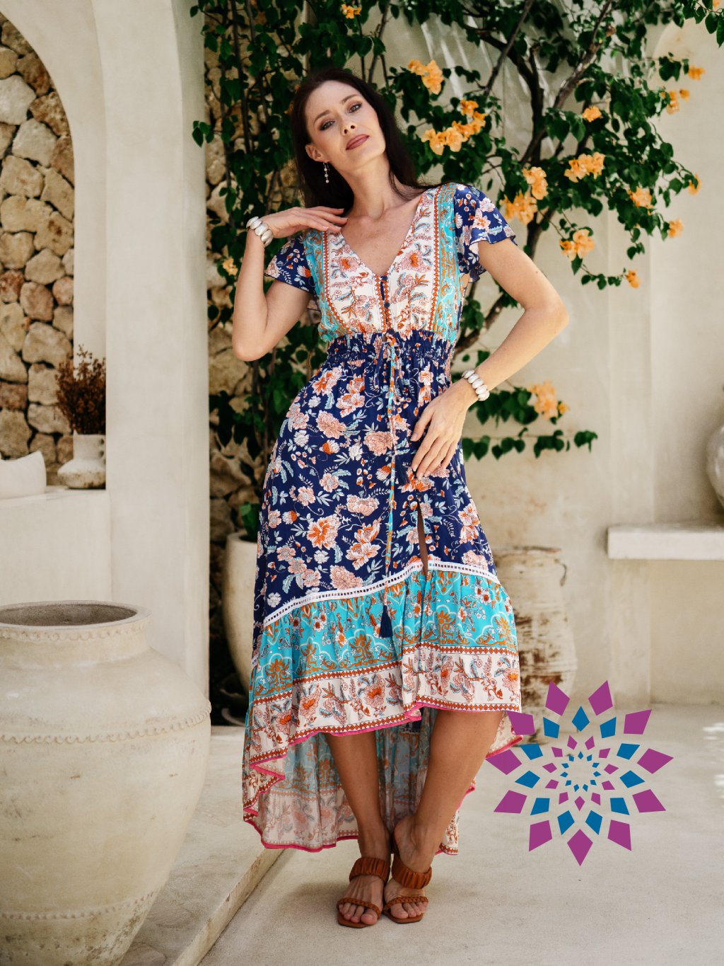 Dlouhé šaty Magdalena z kolekce SECRET šité ze 100% viskózy I. jakosti s krátkým rukávem a pružnou gumou pod prsy. Šaty mají smyslně odhalená záda se stahováním za krkem a širší gumou zakrývající podprsenku, rozevlátou sukni a rozepínatelné knoflíčky po celé přední straně šatů.