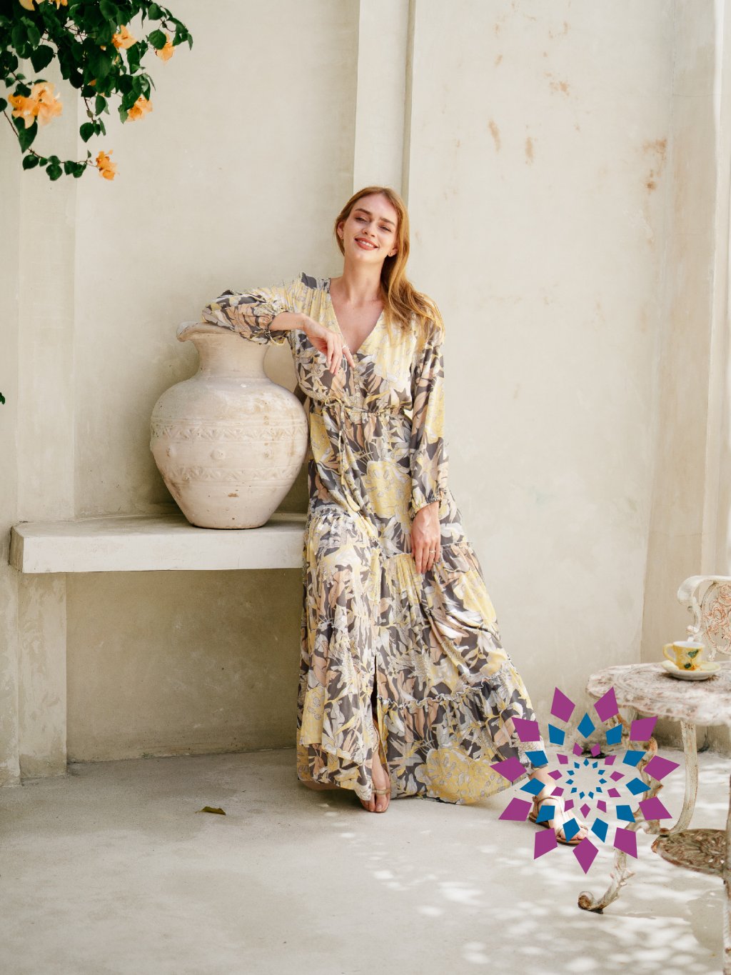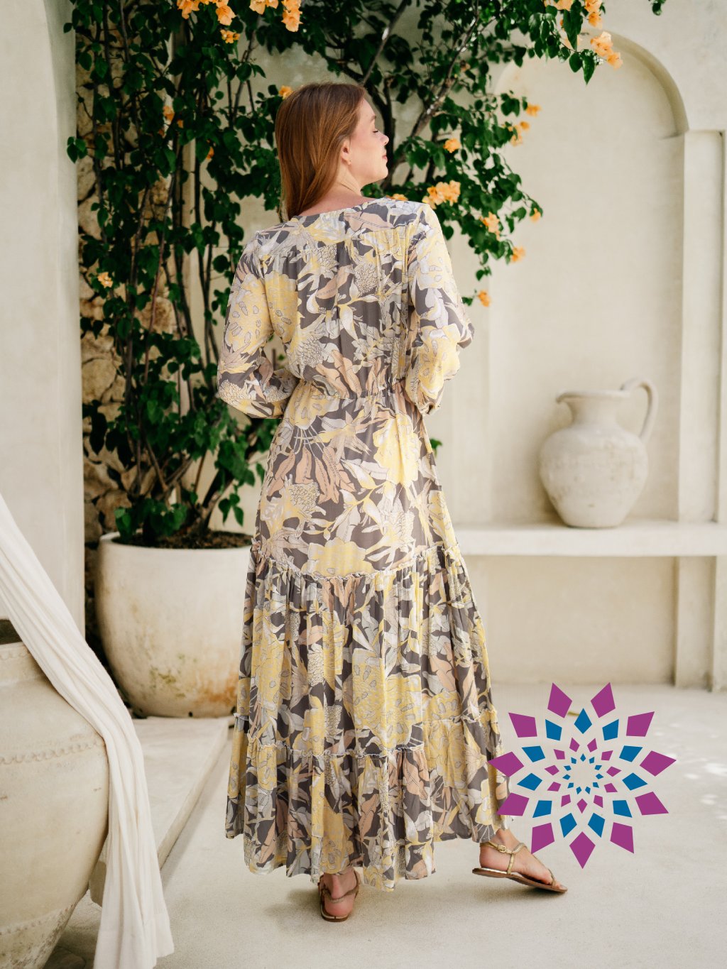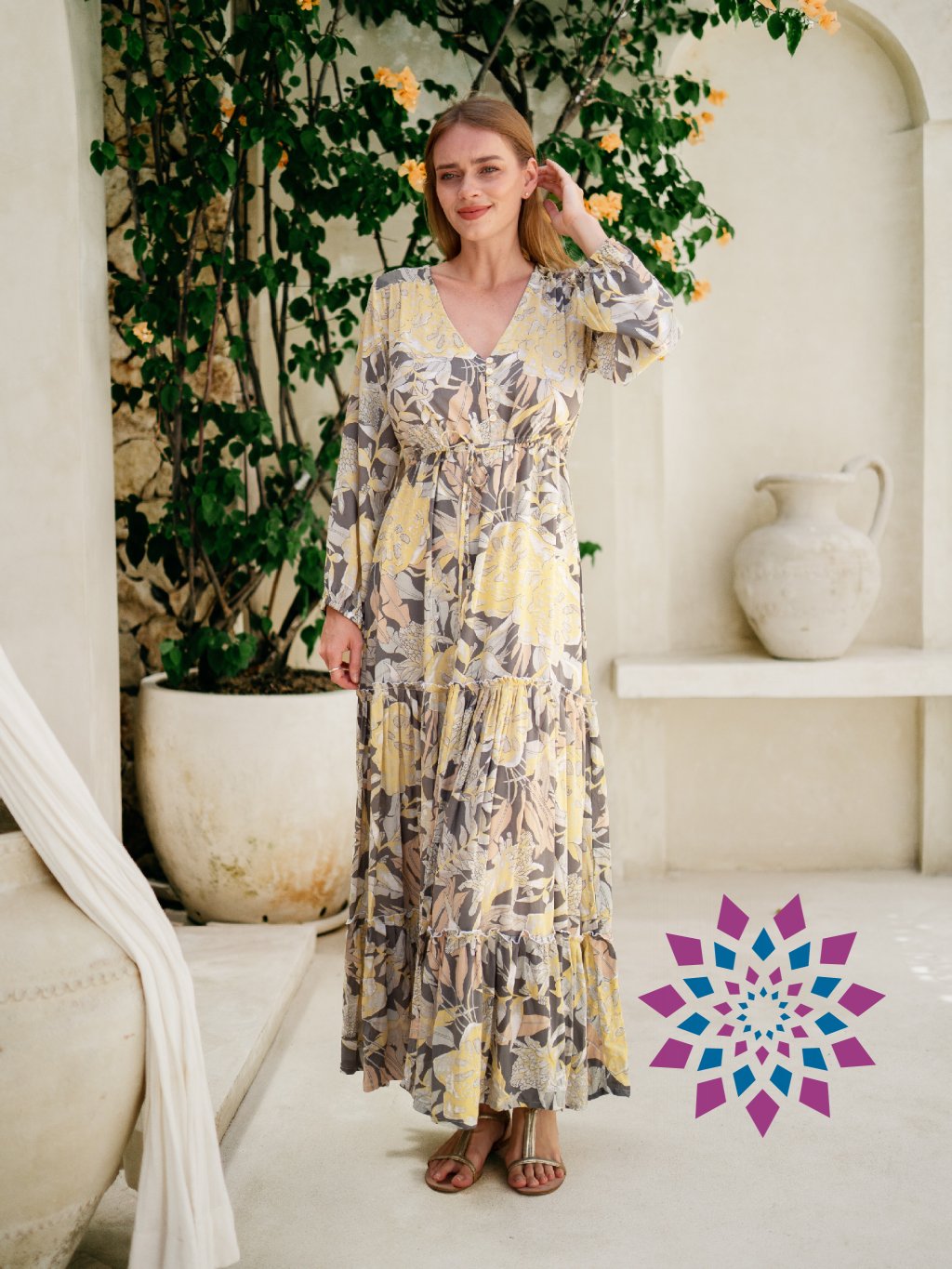 Dlouhé šaty SECRET Maldive šité ze 100% viskózy I. jakosti Vás naprosto omámí svou jemností materiálu. Šaty jsou s dlouhým rukávem zakončeným elastickou gumičkou a mají dekolt s rozepínatelnými knoflíčky. Pod prsy je řešené stahování na šňůrku se střapci. Na přední straně mají šaty menší rozparek.