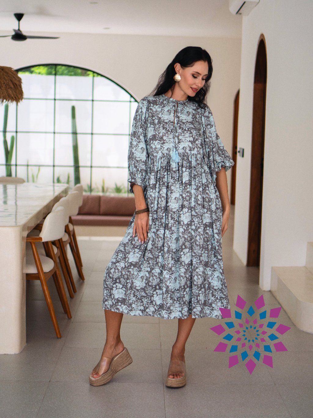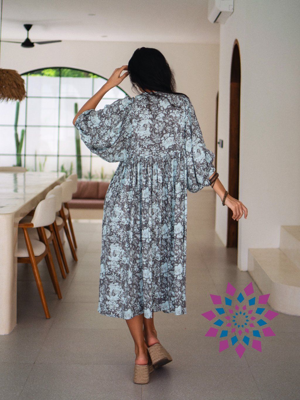 Materiál je 100% viskóza – kvalitní, jemná, na dotek blízká hedvábí. Na těle ji skoro nevnímáš. Střih je vzdušný, s důrazem na pohodlí a ženskou siluetu.