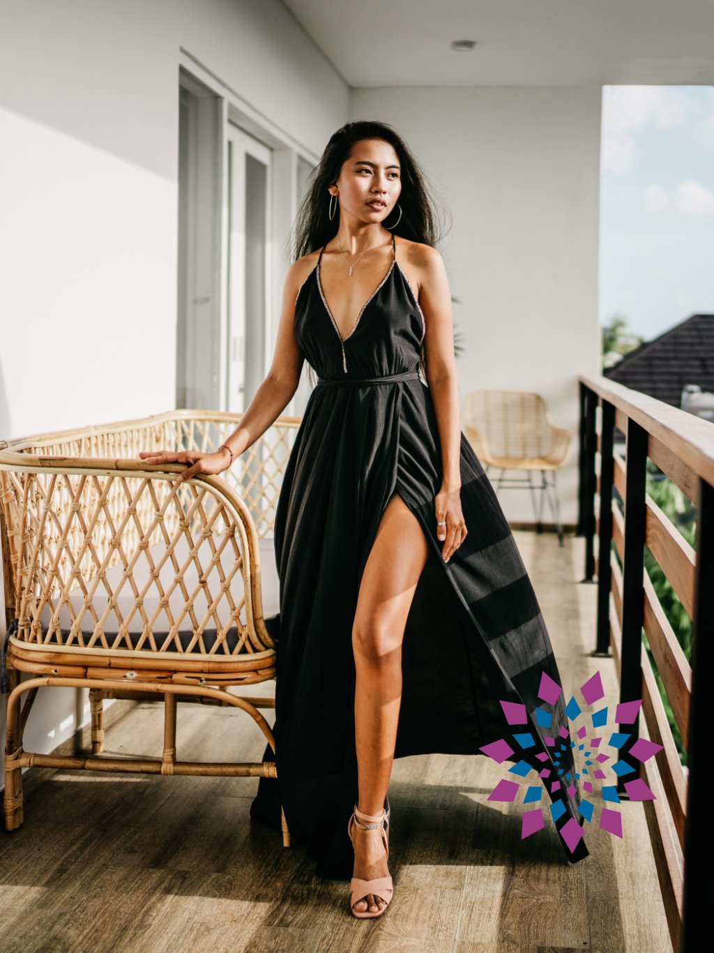 Dlouhé společenské šaty s dlouhými, tenkými ramínky, které se rafinovaně zavazují pod prsy nebo kolem pasu. Šaty mají pružnou gumu pod prsy, která je zdobená ručně našitými korálky. Sukně s rozparkem na boku. Šaty jsou vhodné pro společenskou nebo slavnostní příležitost, ale také na běžné nošení.