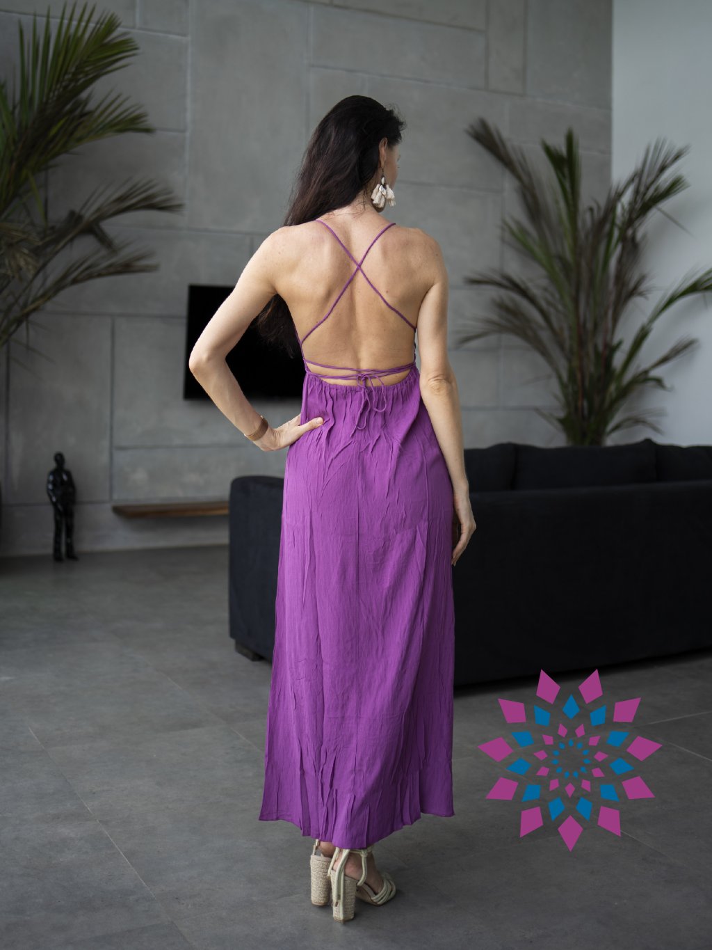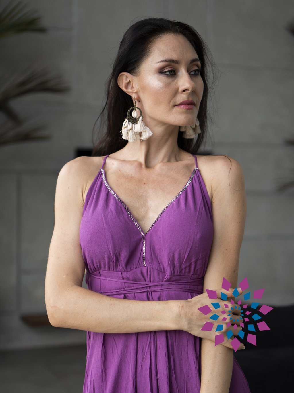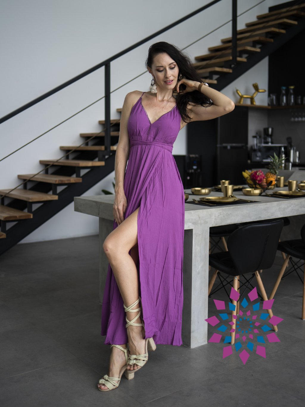 Dlouhé společenské šaty s dlouhými, tenkými ramínky, které se rafinovaně zavazují pod prsy nebo kolem pasu. Šaty mají pružnou gumu pod prsy, která je zdobená ručně našitými korálky. Sukně s rozparkem na boku. Šaty jsou vhodné pro společenskou nebo slavnostní příležitost, ale také na běžné nošení.