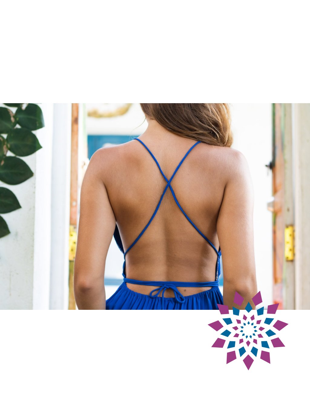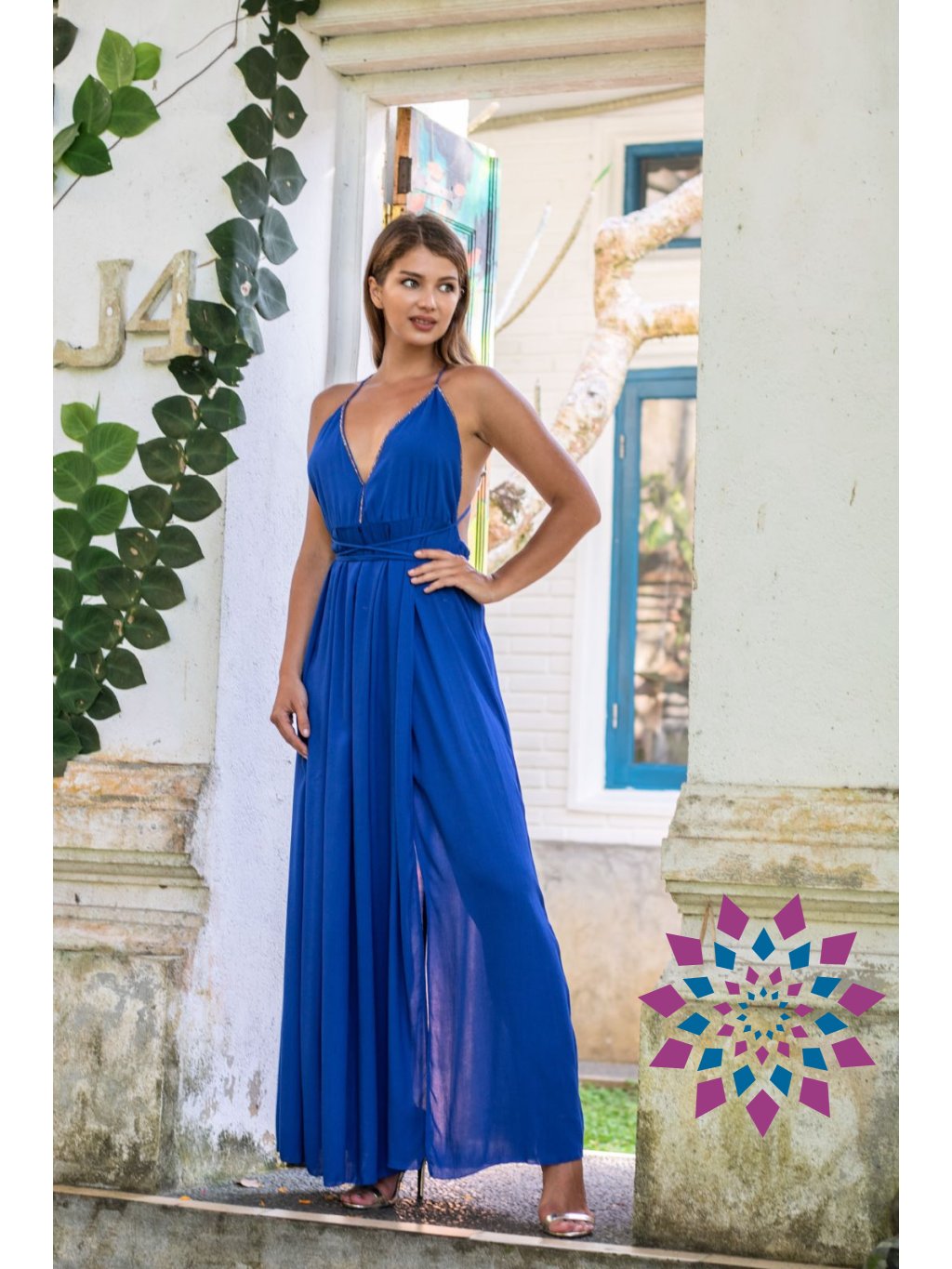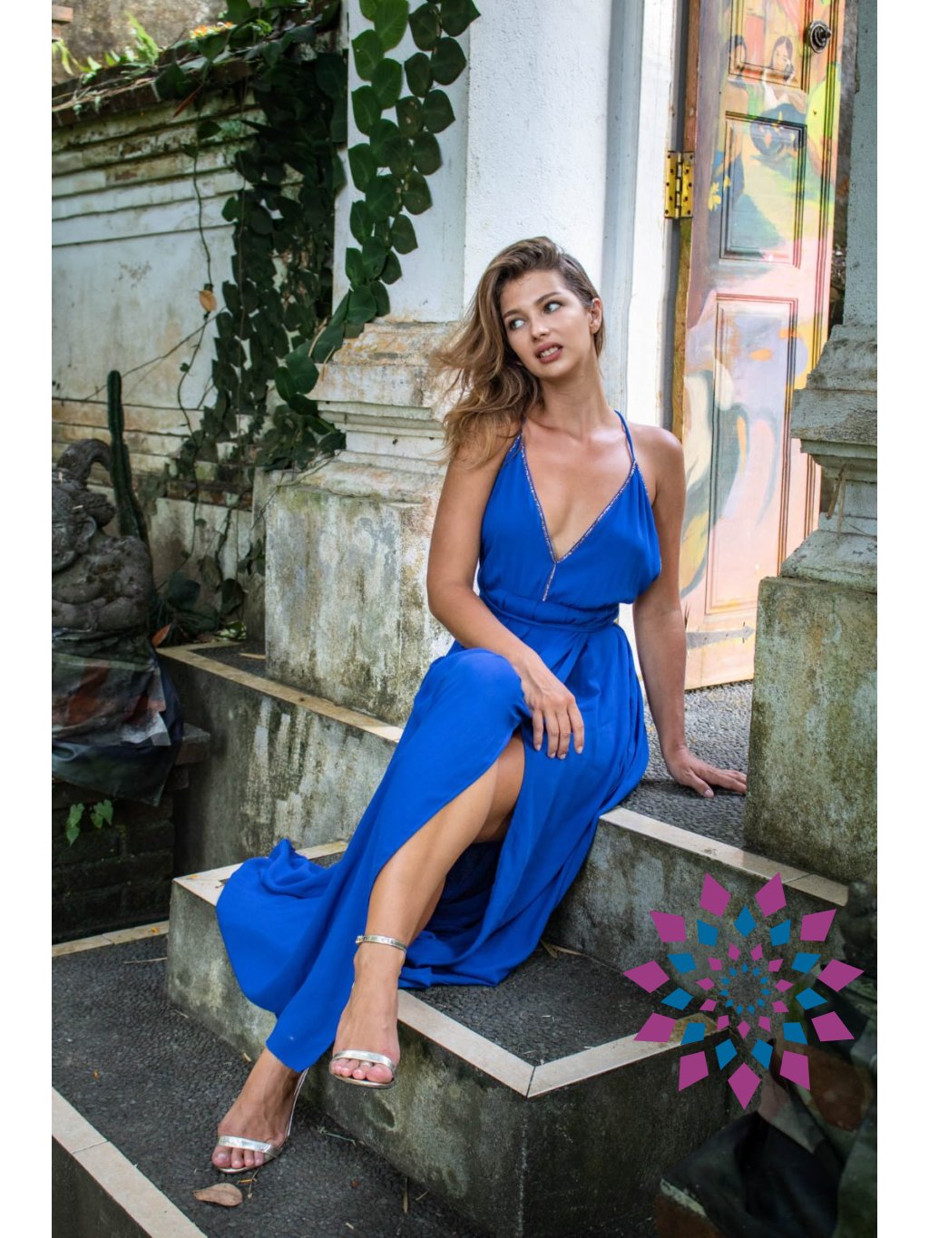 Dlouhé společenské šaty s dlouhými, tenkými ramínky, které se rafinovaně zavazují pod prsy nebo kolem pasu. Šaty mají pružnou gumu pod prsy, která je zdobená ručně našitými korálky. Sukně s rozparkem na boku. Šaty jsou vhodné pro společenskou nebo slavnostní příležitost, ale také na běžné nošení.