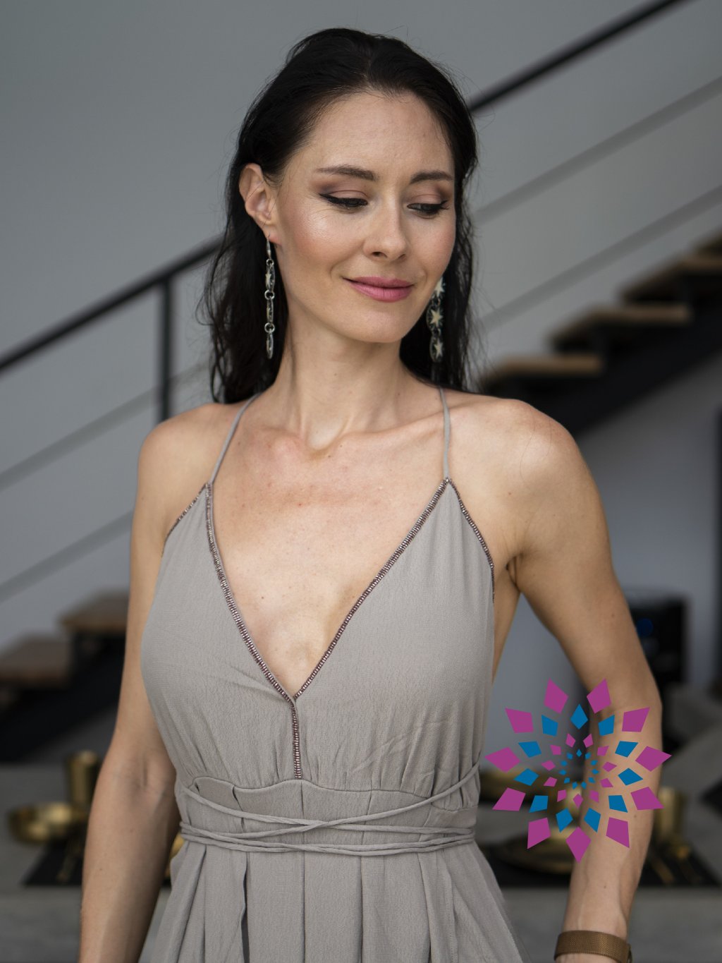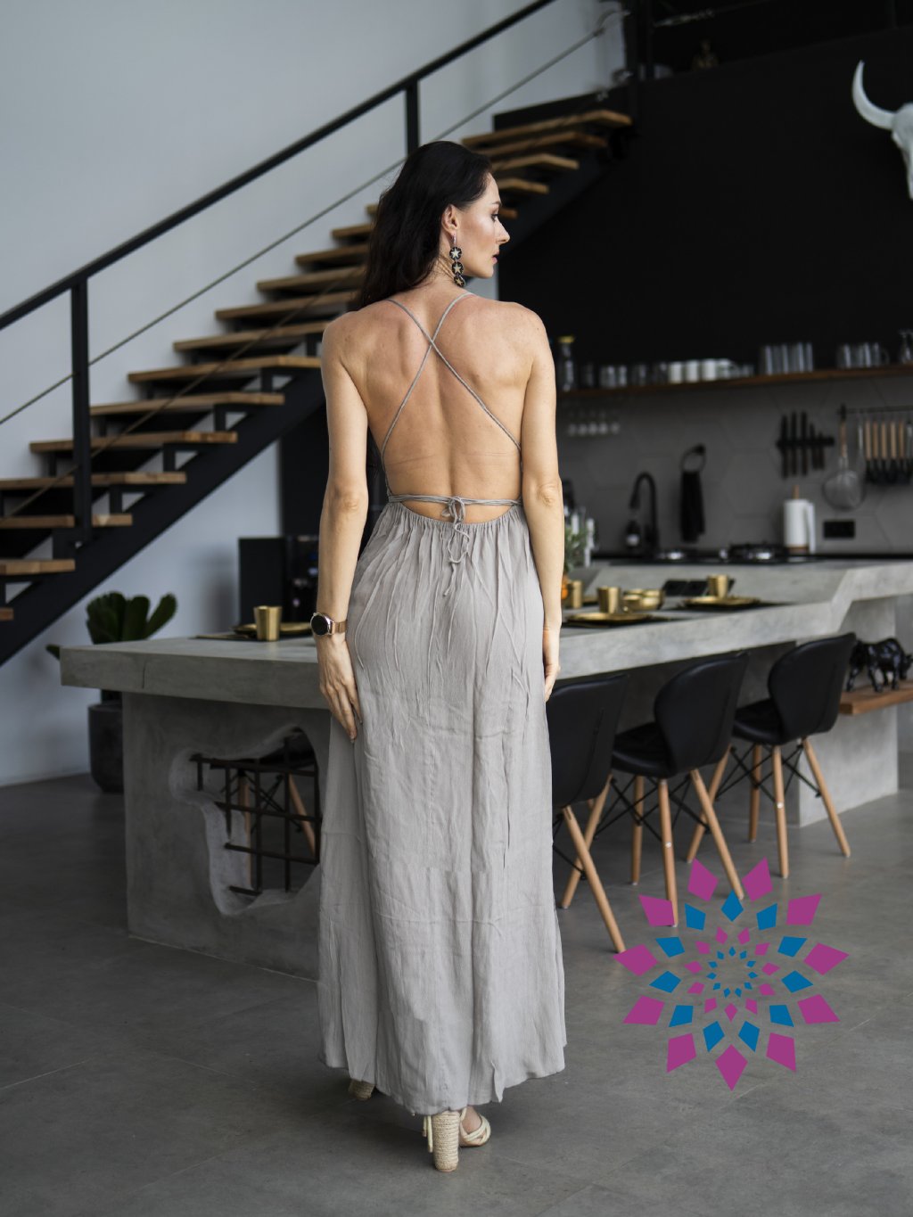 Dlouhé společenské šaty s dlouhými, tenkými ramínky, které se rafinovaně zavazují pod prsy nebo kolem pasu. Šaty mají pružnou gumu pod prsy, která je zdobená ručně našitými korálky. Sukně s rozparkem na boku. Šaty jsou vhodné pro společenskou nebo slavnostní příležitost, ale také na běžné nošení.