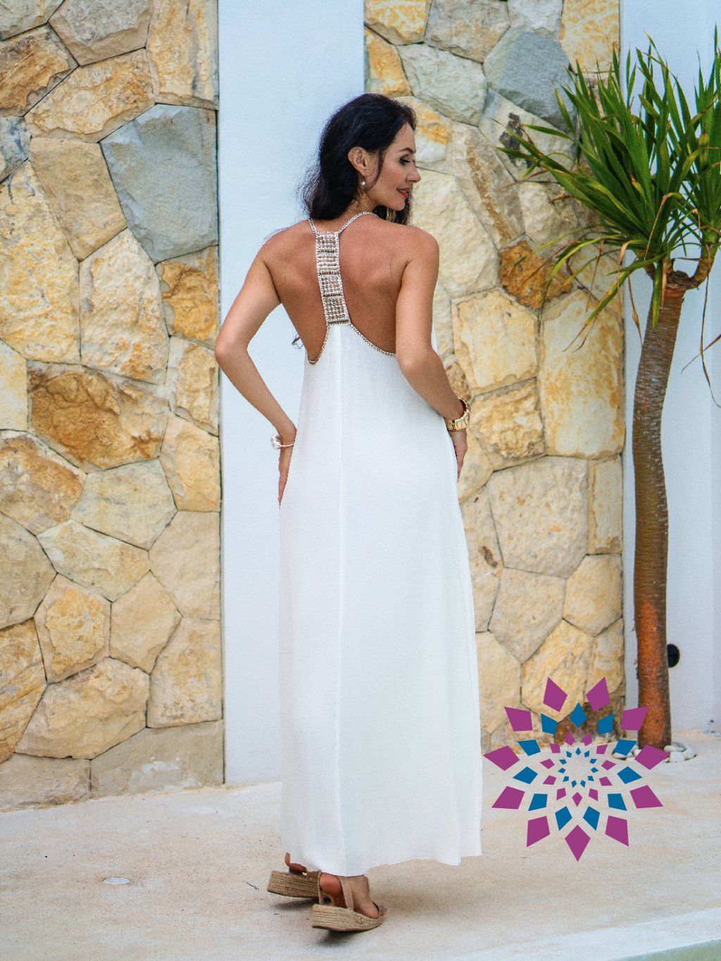 Volně splývají po těle a nikde netlačí. Ramínka drží tvar nahoře, zatímco látka padá rovně dolů. Při chůzi se lehce vlní a drží si svůj tvar. Výstřih je čistý, lemovaný drobnými kamínky, které zachytí světlo. Stejný detail najdeš i vzadu, kde ho doplňuje výraznější aplikace mezi ramínky. Záda zůstávají otevřená.