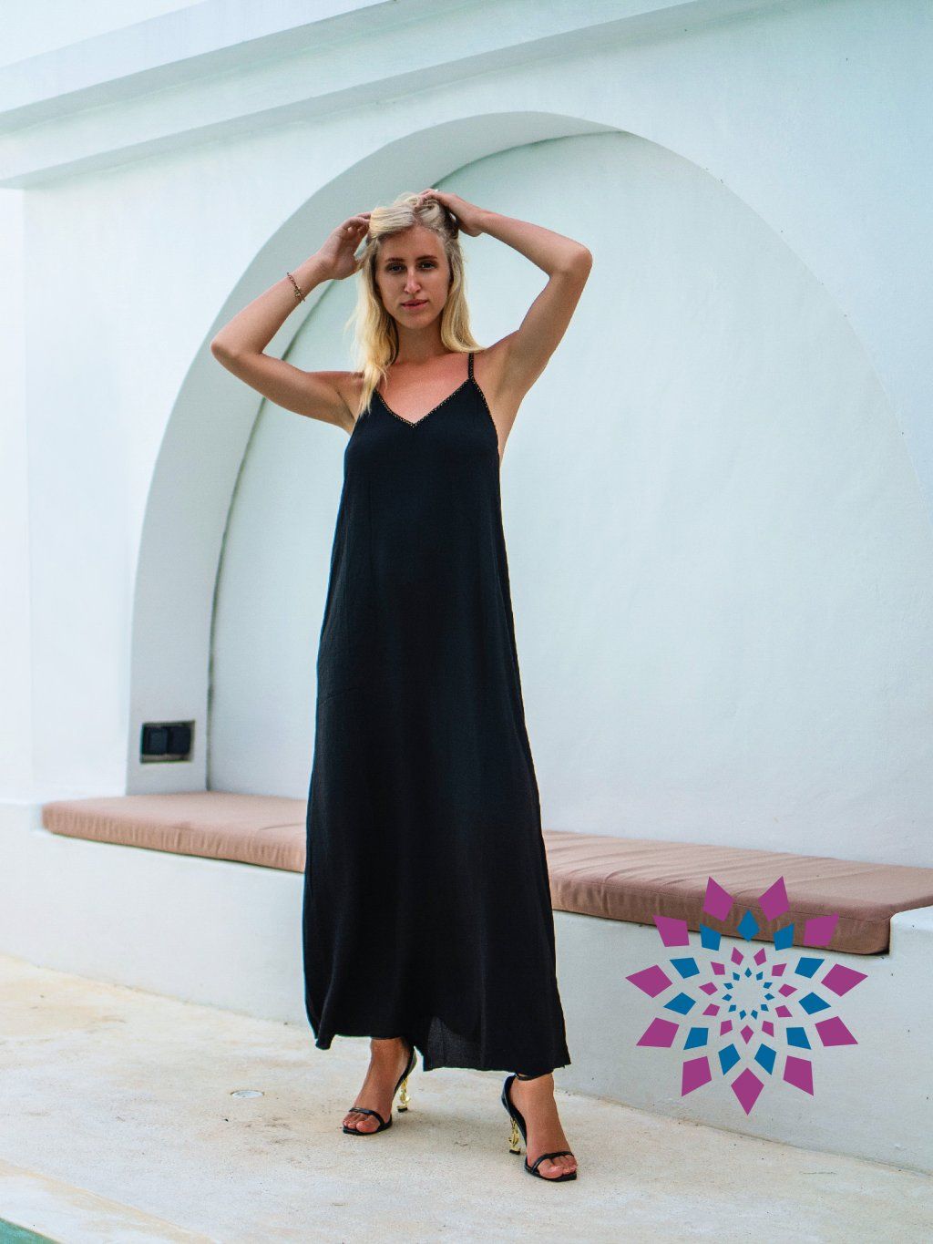 Volně splývají po těle a nikde netlačí. Ramínka drží tvar nahoře, zatímco látka padá rovně dolů. Při chůzi se lehce vlní a drží si svůj tvar. Výstřih je čistý, lemovaný drobnými kamínky, které zachytí světlo. Stejný detail najdeš i vzadu, kde ho doplňuje výraznější aplikace mezi ramínky. Záda zůstávají otevřená.