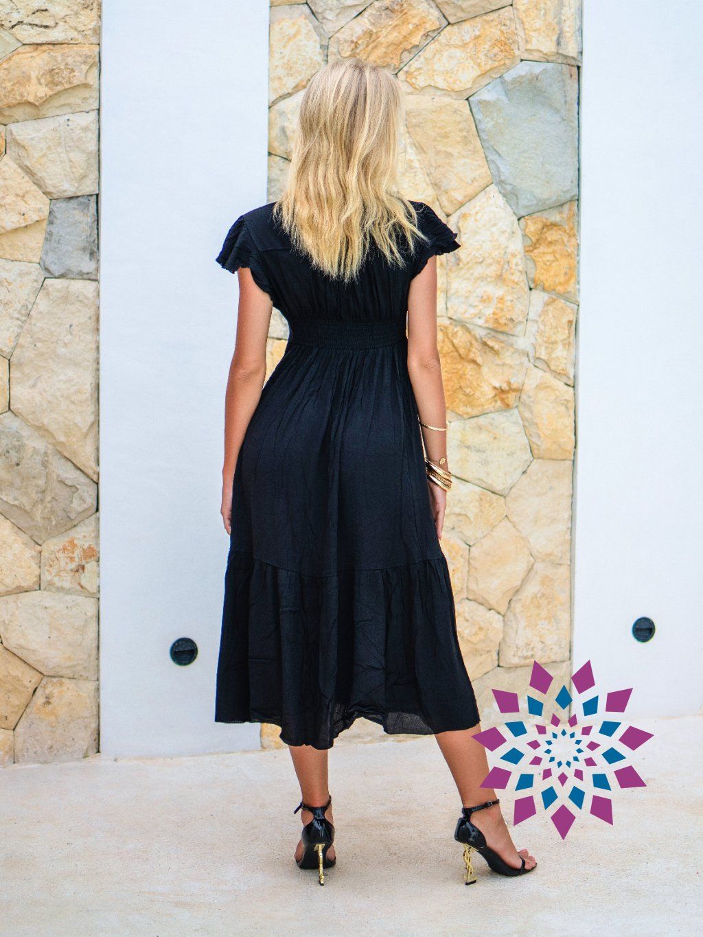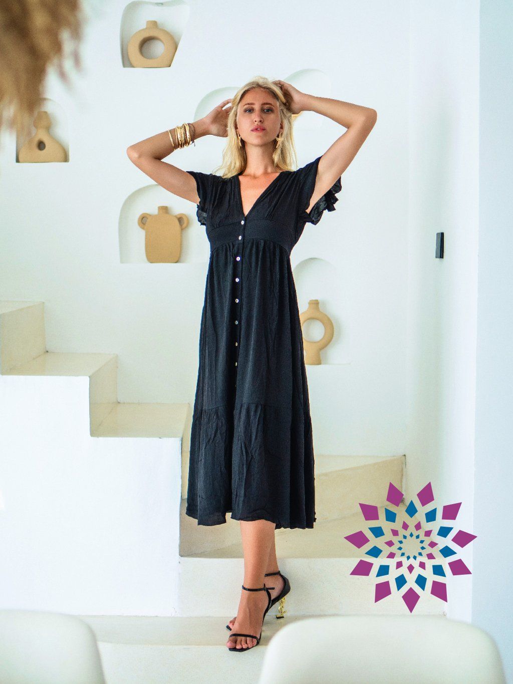 Na těle sedí v horní části přesně. Pružný pas zvýrazní siluetu a sukně se volně rozšiřuje. Výstřih do V s knoflíky otevírá dekolt, rukávy lehce kryjí ramena. Při chůzi se spodní část pohybuje a drží tvar.