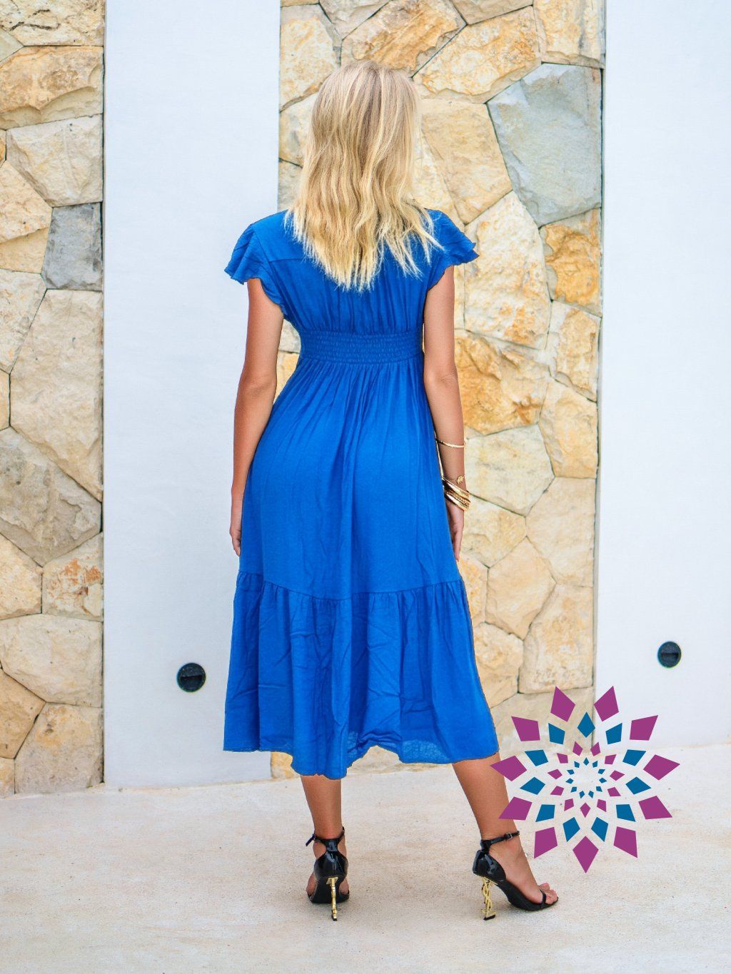 Na těle sedí v horní části přesně. Pružný pas zvýrazní siluetu a sukně se volně rozšiřuje. Výstřih do V s knoflíky otevírá dekolt, rukávy lehce kryjí ramena. Při chůzi se spodní část pohybuje a drží tvar.