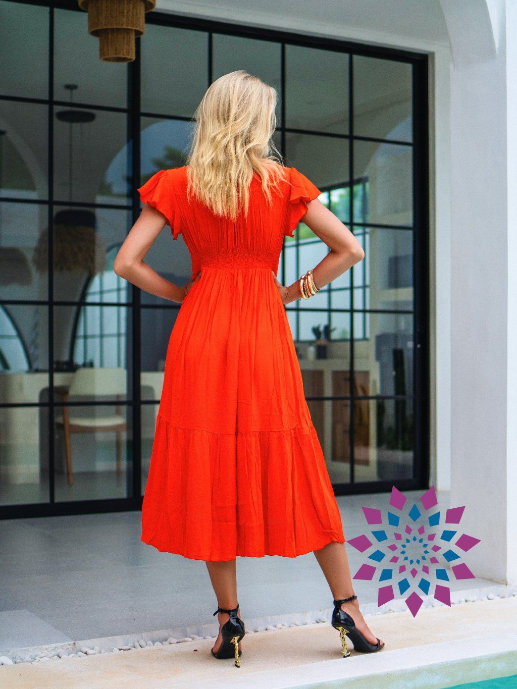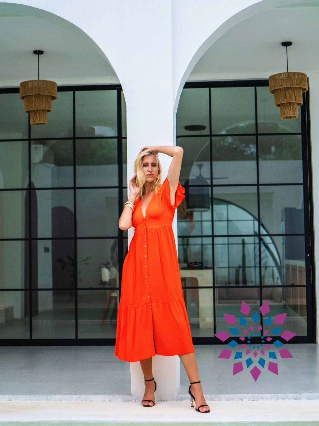 Na těle sedí v horní části přesně. Pružný pas zvýrazní siluetu a sukně se volně rozšiřuje. Výstřih do V s knoflíky otevírá dekolt, rukávy lehce kryjí ramena. Při chůzi se spodní část pohybuje a drží tvar.
