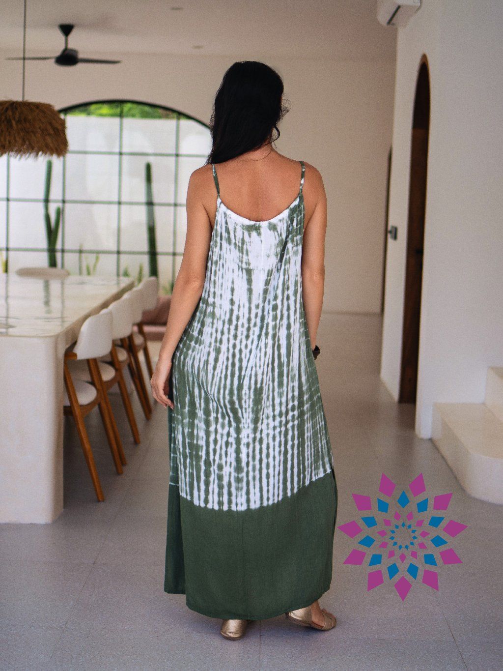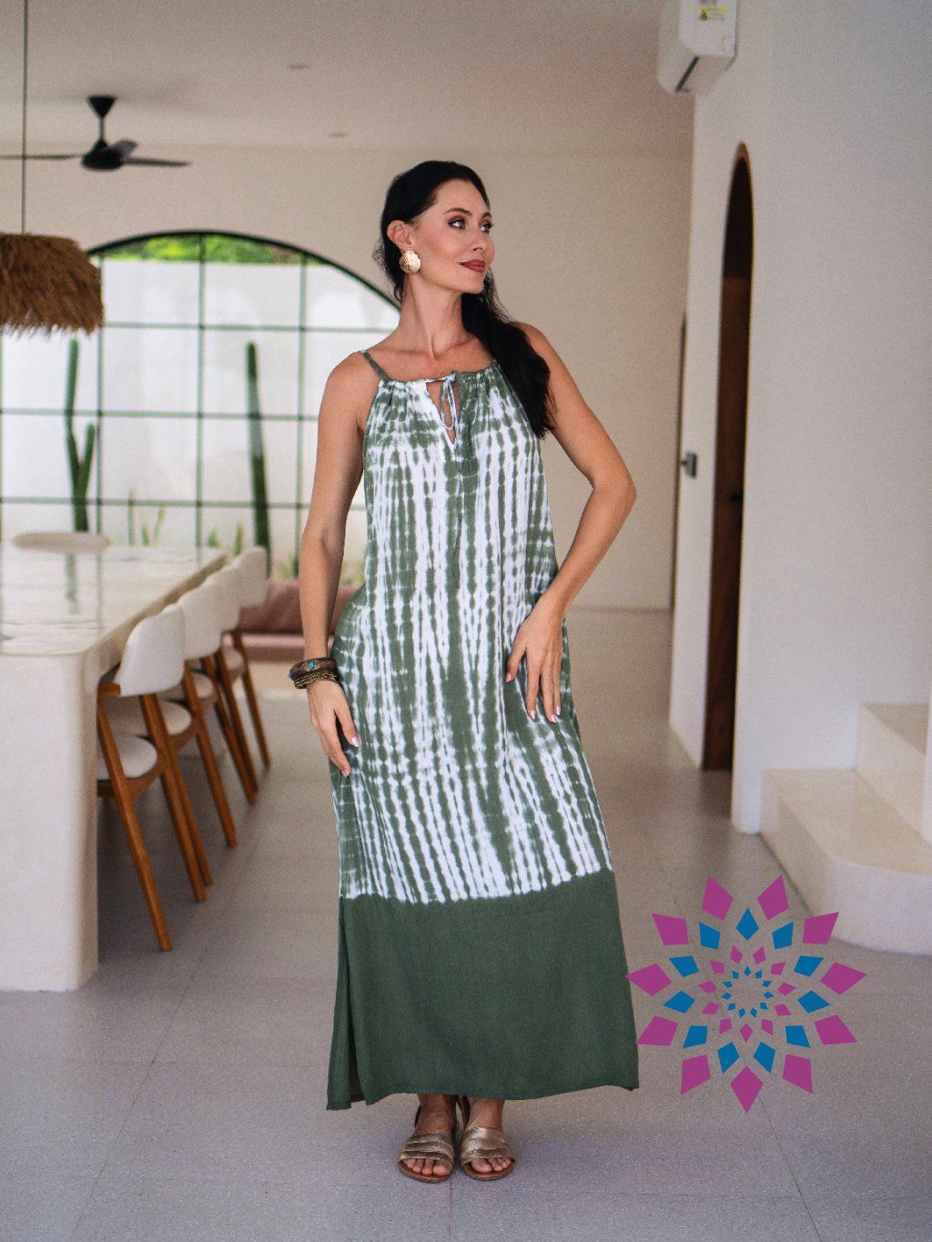 Barva: Khaki. Barvení technikou tie-dye vytváří přechody barev. Každý kus je trochu jiný.