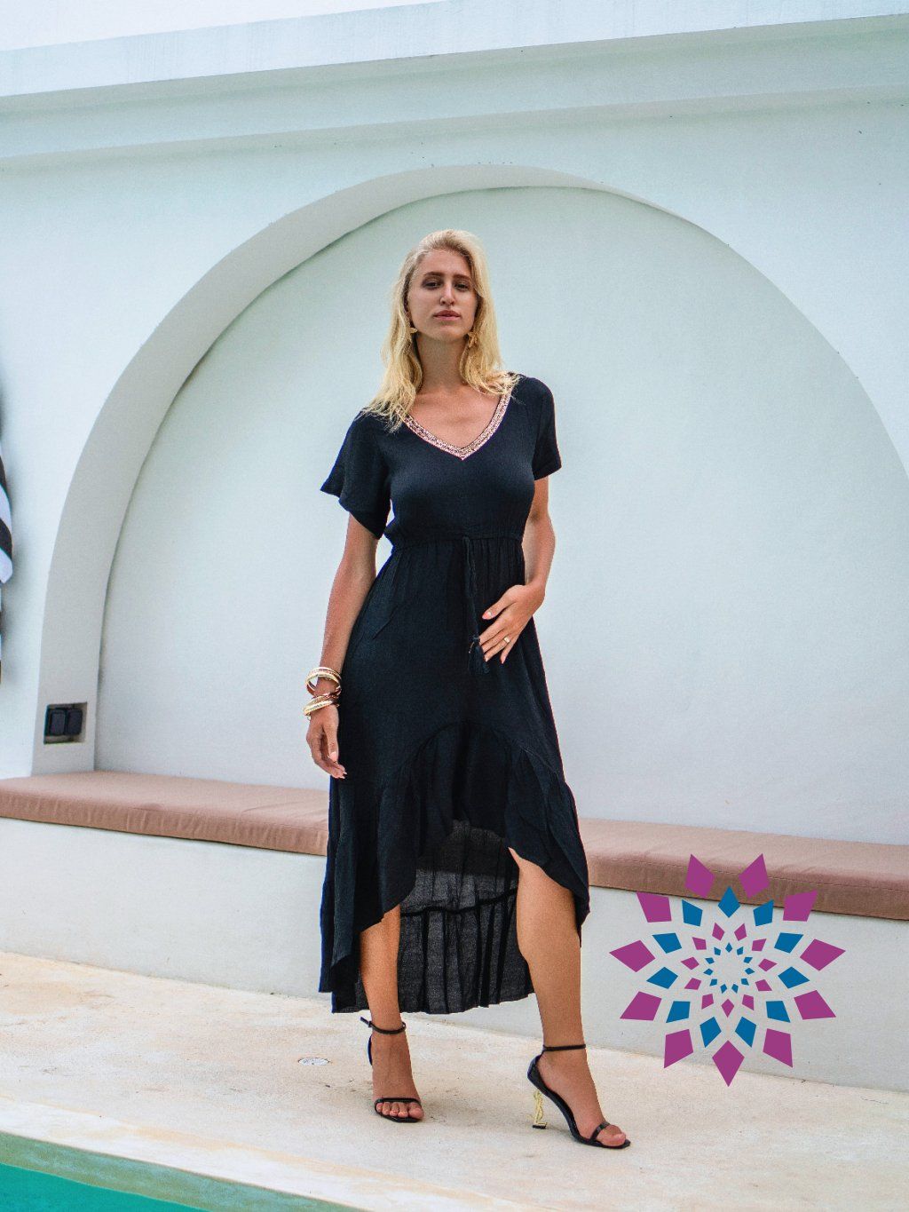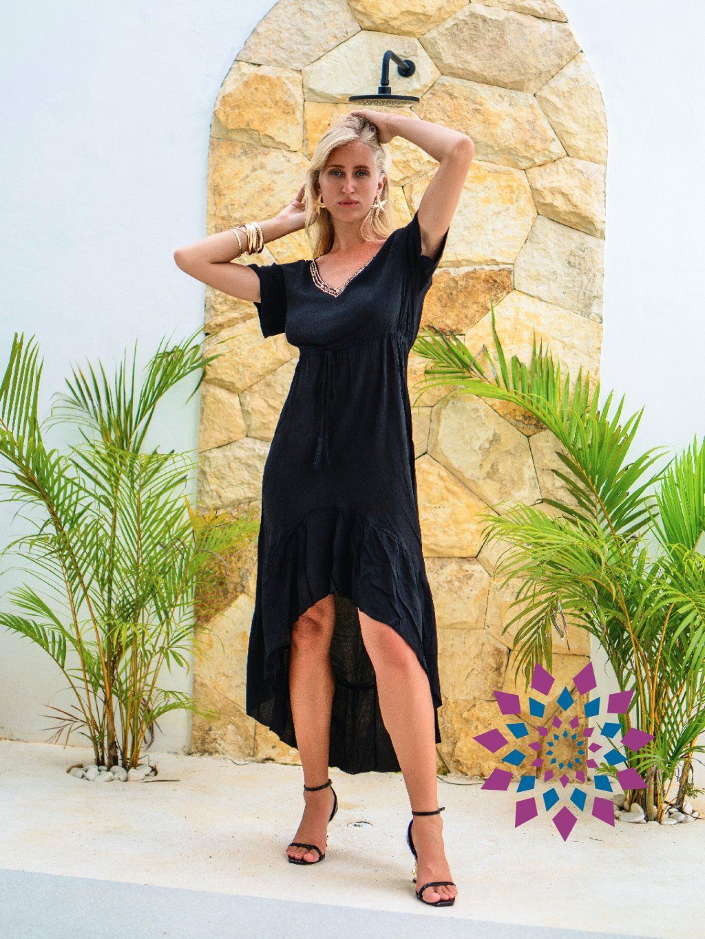 Horní část sedí lehce na těle a krátké rukávy dávají volnost v pohybu. Výstřih do V je lemovaný drobnými korálky, které přidají detail bez zbytečné výraznosti. V pase je jemné stažení na šňůrku, takže si tvar upravíš podle sebe. Sukně se směrem dolů rozšiřuje a při chůzi se přirozeně nese. Zadní část je čistá a drží jednoduchou linii.