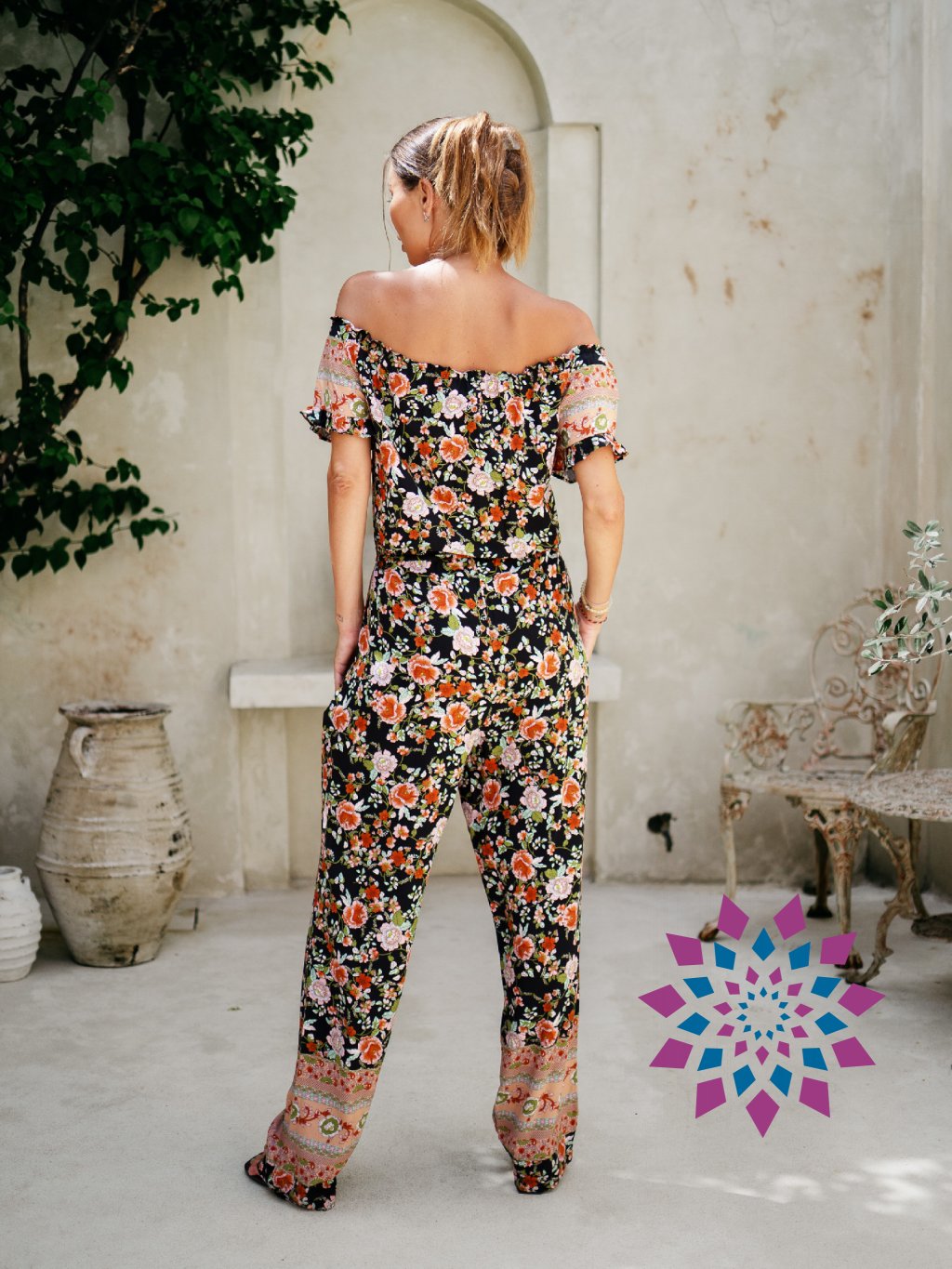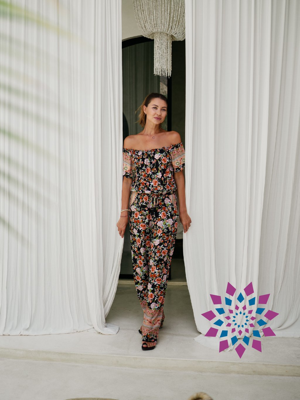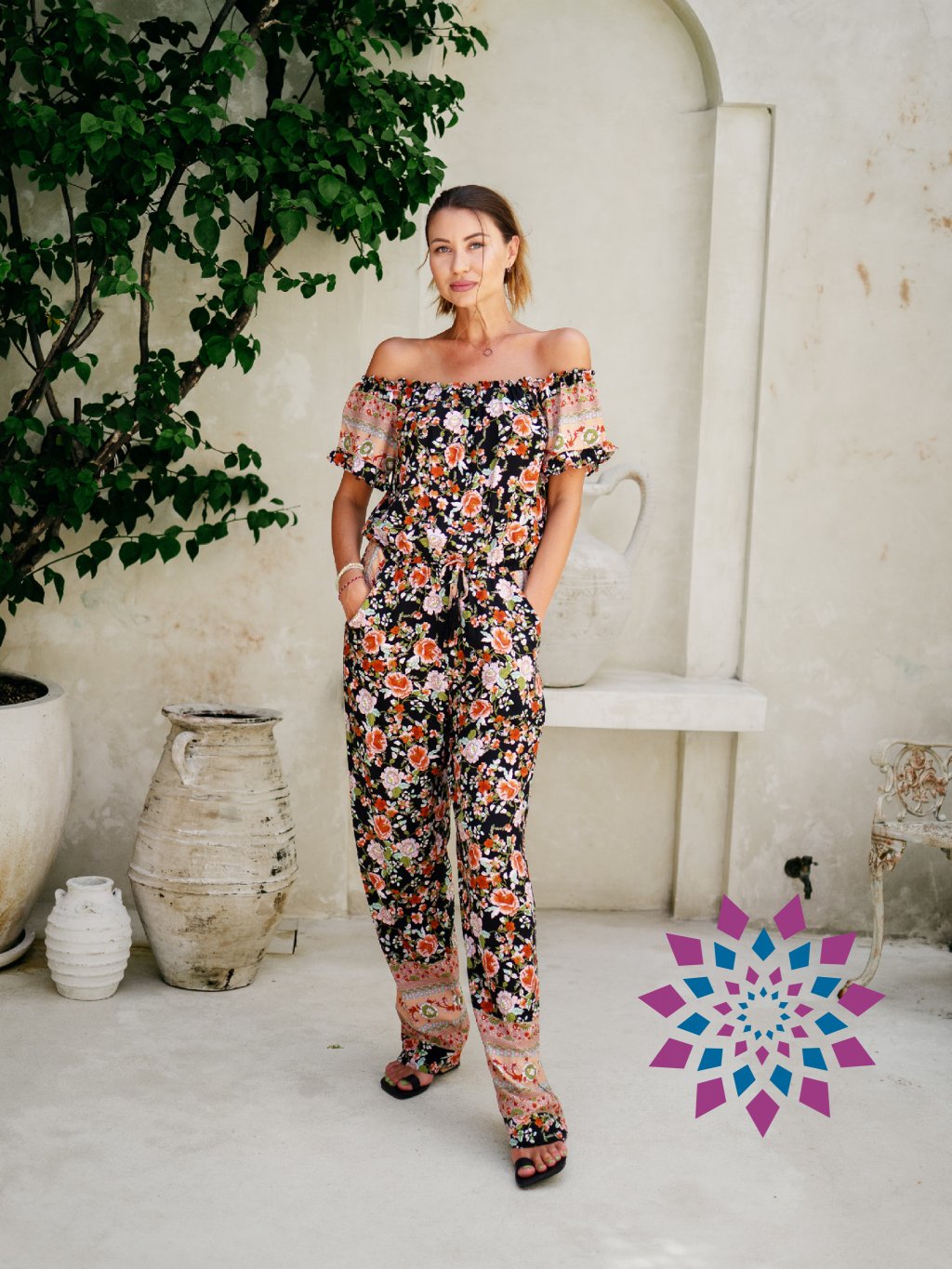 Dlouhý, elegantní overal Sahara z kolekce SECRET, s krátkým rukávem a pružnou gumou kolem ramen, která dovoluje overal nosit dvěma způsoby - stáhnutý na ramena nebo klasicky. Overal má kapsy a tenkou, pružnou gumu v pase se stahováním a ozdobnými střapci.