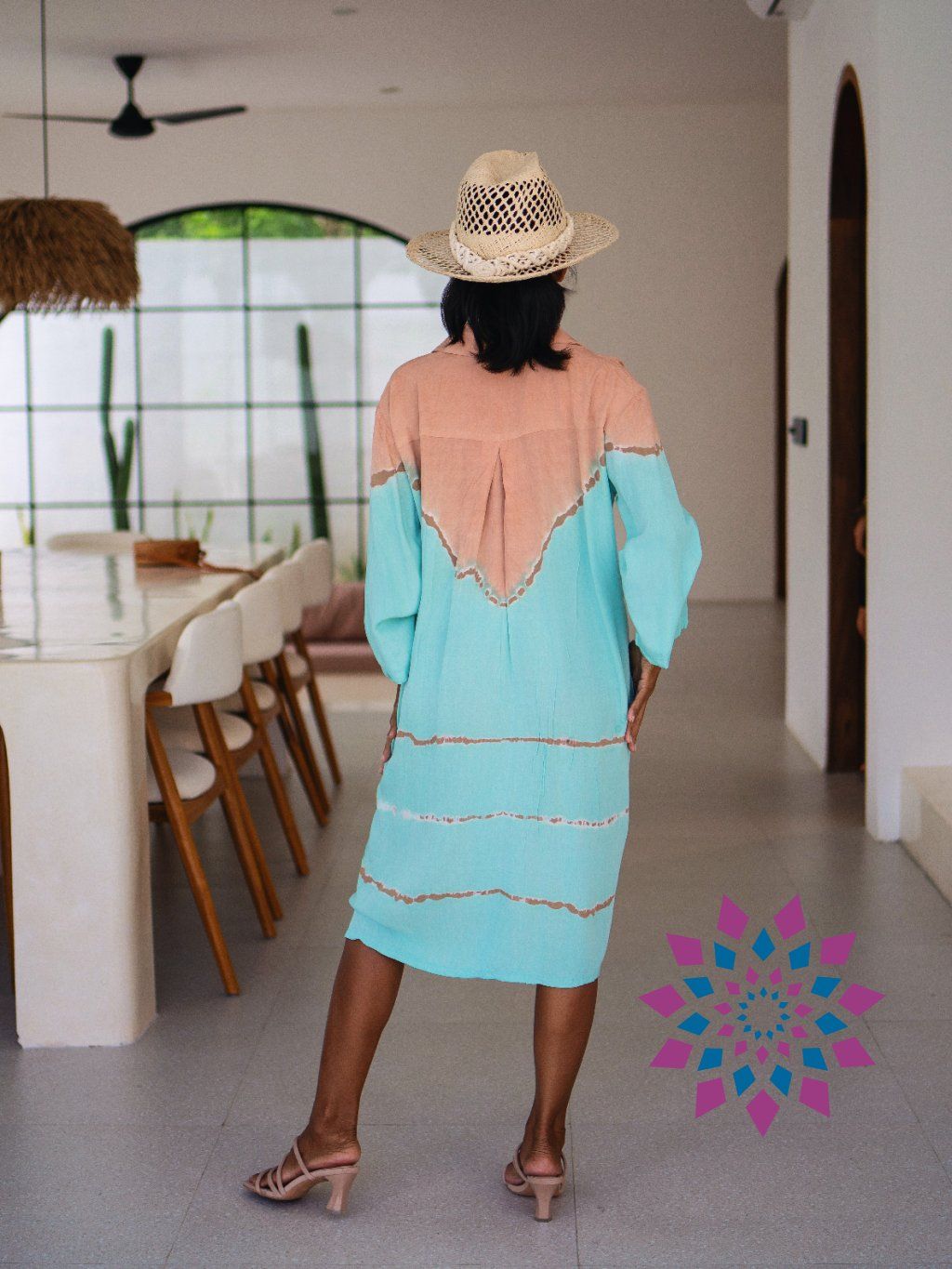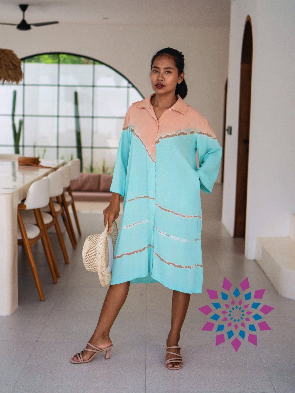 Materiál: 100% viskóza, nejkvalitnější druh viskózy, který svojí jemností připomíná hedvábí. Lehká a prodyšná. Látka je ručně barvená batikou (tie-dye), takže každý kus má trochu jiný přechod barev.