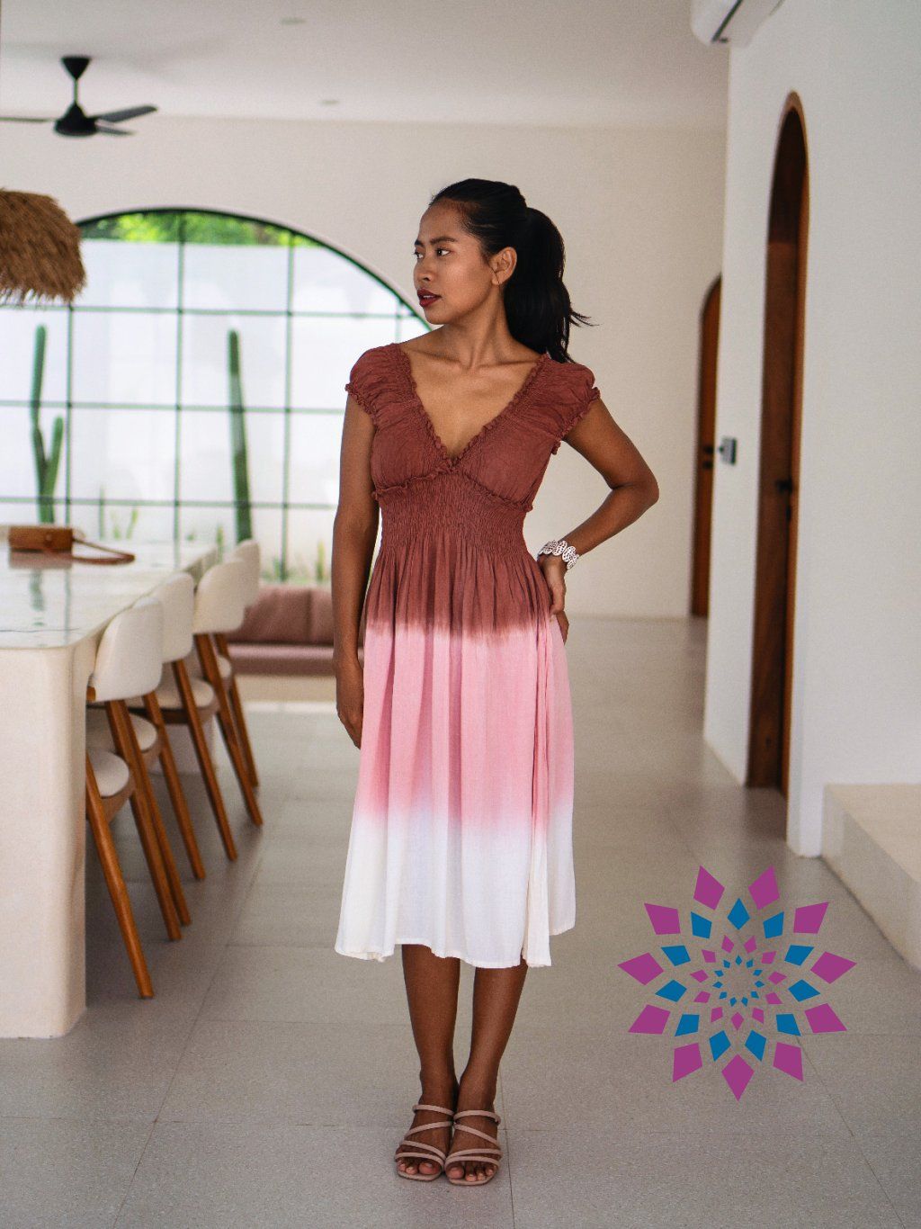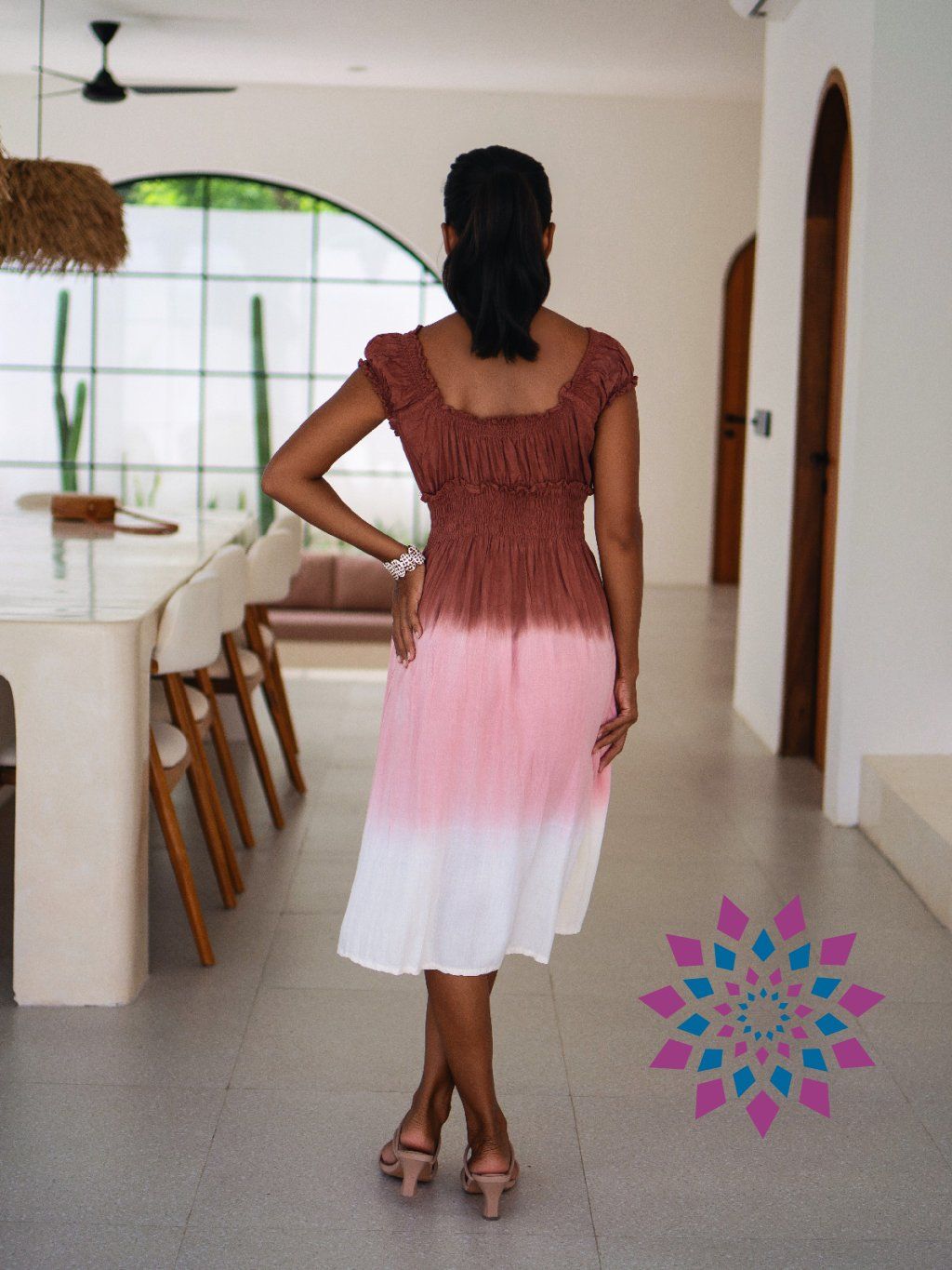 Barva: Růžovocihlová. Barvení technikou tie-dye vytváří přechody barev. Každý kus je trochu jiný.