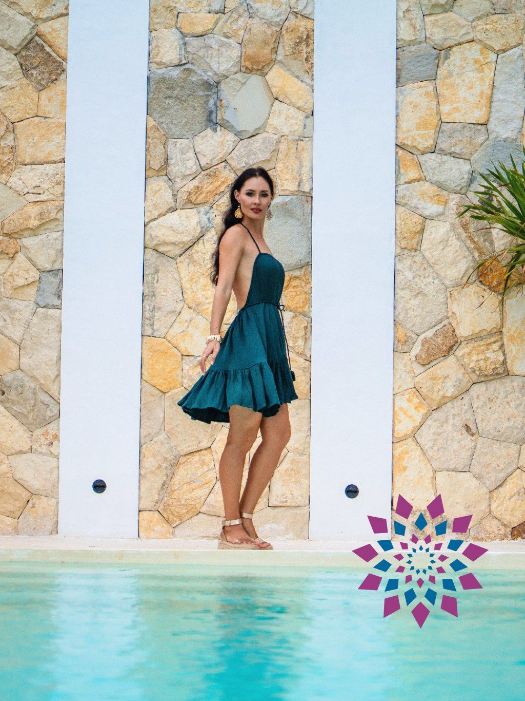 Na těle sedí volně, pásek v pase drží tvar a zvýrazní siluetu. Horní část se váže za krkem, záda zůstávají otevřená. Sukně se při pohybu rozehrává a díky volánu působí živě a uvolněně.