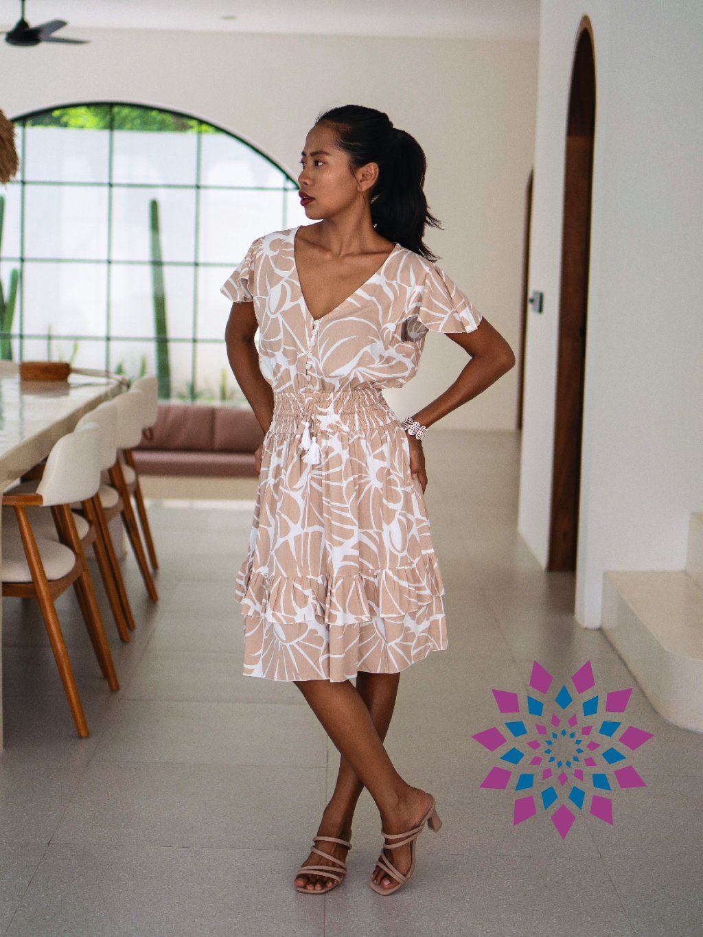 Horní část drží tvar, pas se přizpůsobí a sukně se volně pohybuje s tebou. Krátké rukávy nechávají ramena vyniknout, délka působí lehce a žensky. Cítíš se volně a jistě.