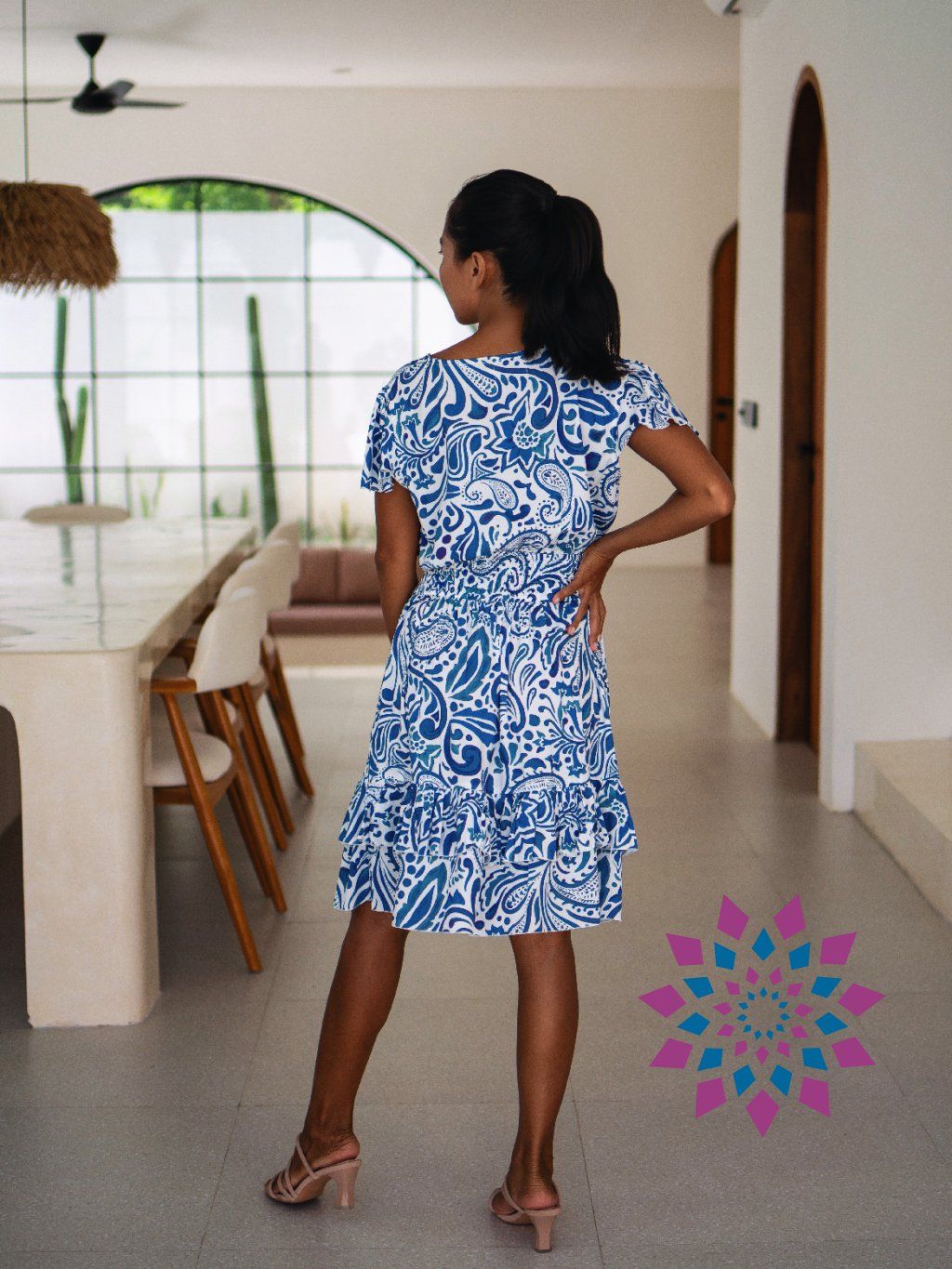 Horní část drží tvar, pas se přizpůsobí a sukně se volně pohybuje s tebou. Krátké rukávy nechávají ramena vyniknout, délka působí lehce a žensky. Cítíš se volně a jistě.