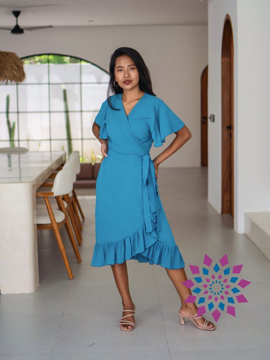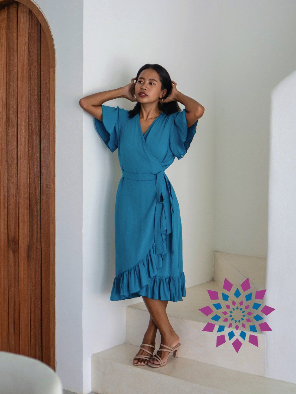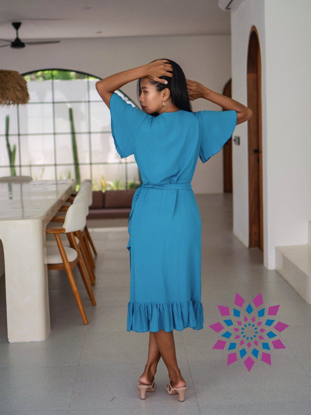 Střih si upravíš utažením v pase i hloubkou výstřihu. Šaty se přizpůsobí postavě, zvýrazní pas a nechají vyniknout dekolt tak, jak ti vyhovuje. Rukávy lehce kryjí ramena, spodní volánek přidává pohyb a udržuje tvar. Na těle jsou lehké, nelepí se a dobře se nosí i celý den.