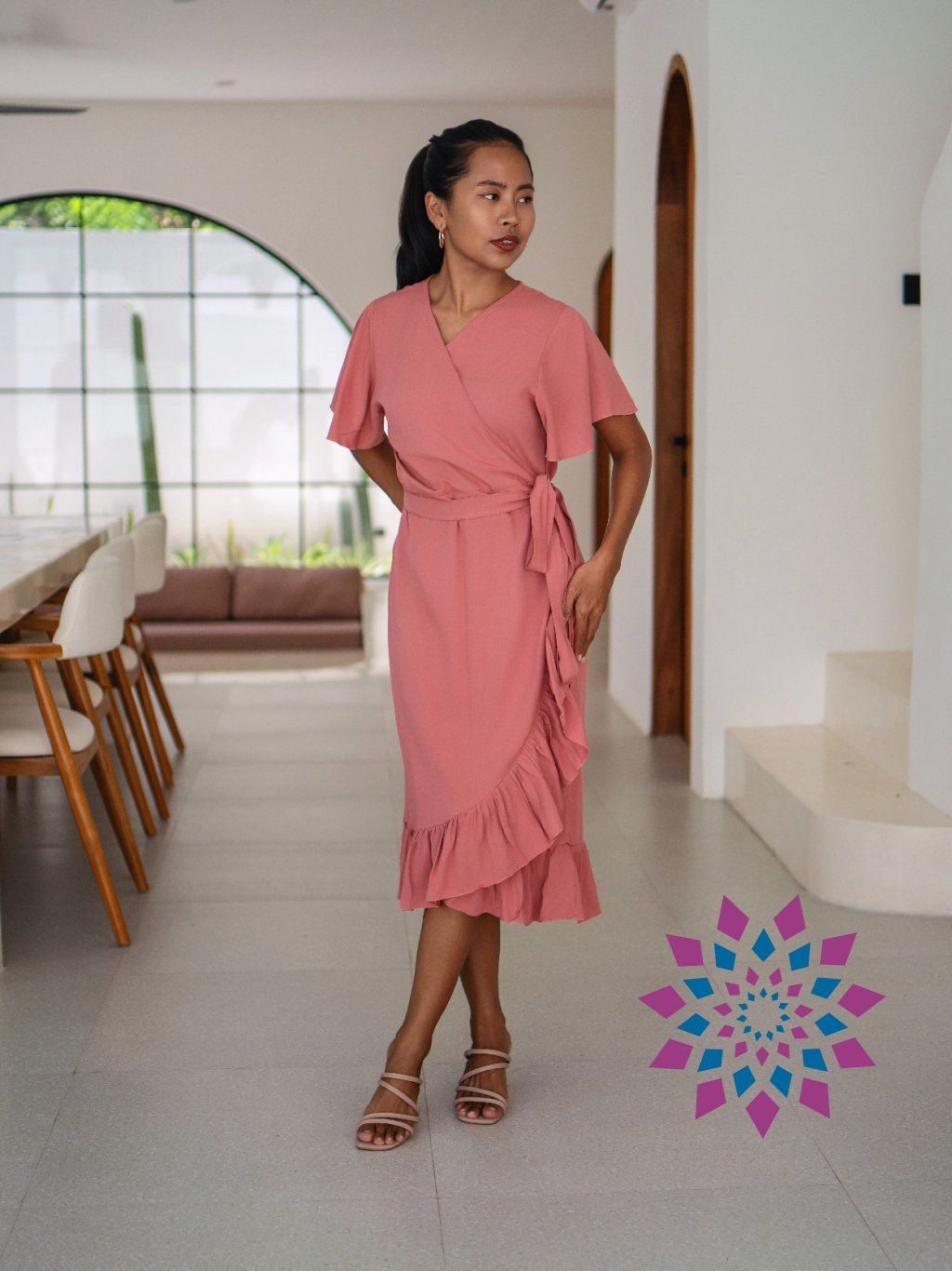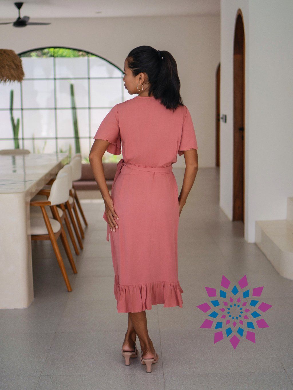 Střih si upravíš utažením v pase i hloubkou výstřihu. Šaty se přizpůsobí postavě, zvýrazní pas a nechají vyniknout dekolt tak, jak ti vyhovuje. Rukávy lehce kryjí ramena, spodní volánek přidává pohyb a udržuje tvar. Na těle jsou lehké, nelepí se a dobře se nosí i celý den.