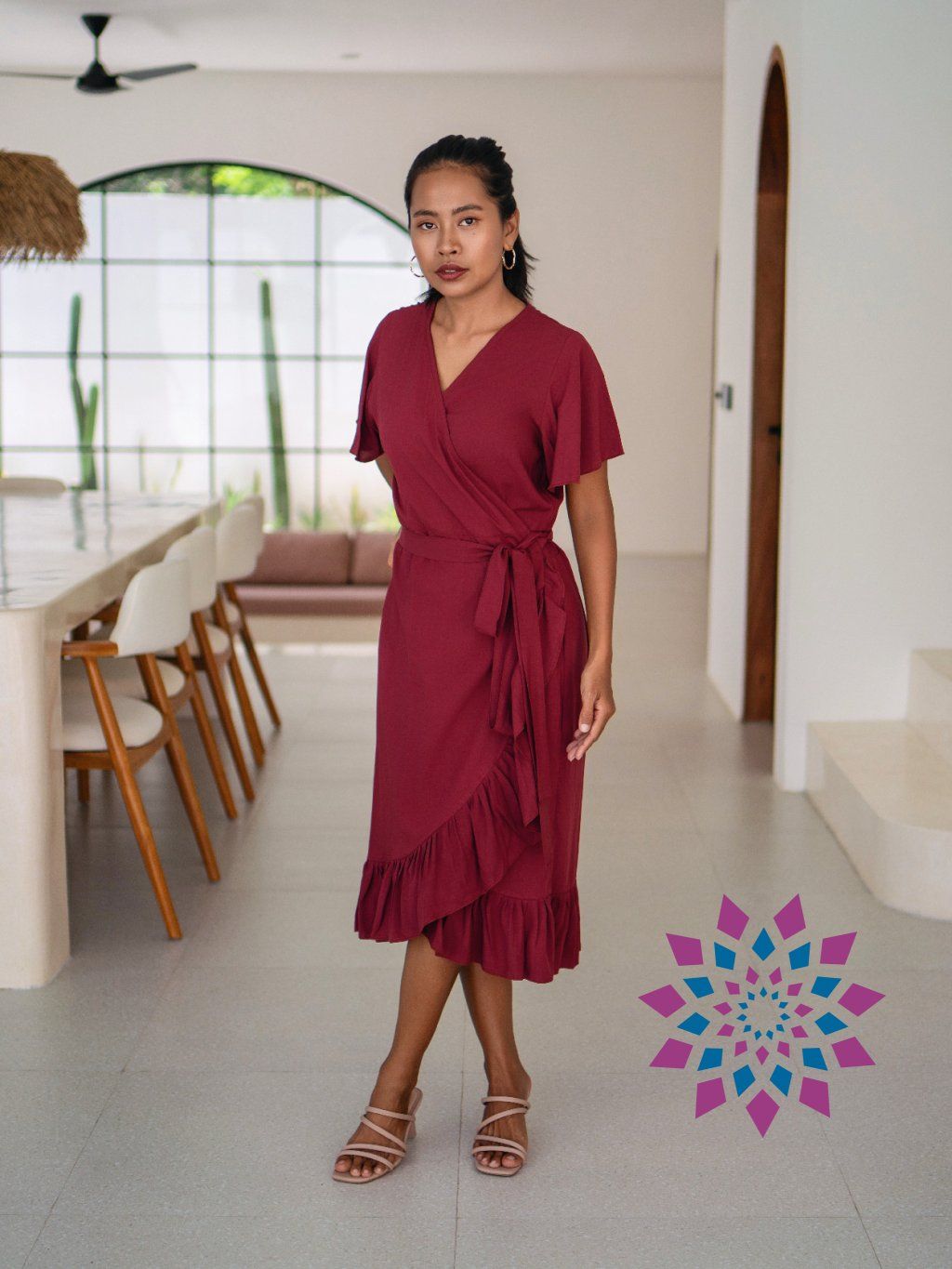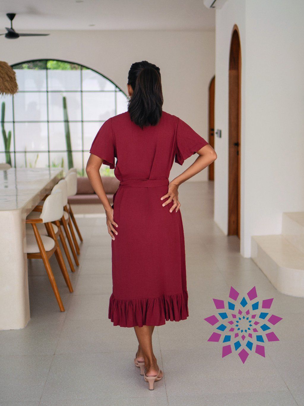Střih si upravíš utažením v pase i hloubkou výstřihu. Šaty se přizpůsobí postavě, zvýrazní pas a nechají vyniknout dekolt tak, jak ti vyhovuje. Rukávy lehce kryjí ramena, spodní volánek přidává pohyb a udržuje tvar. Na těle jsou lehké, nelepí se a dobře se nosí i celý den.