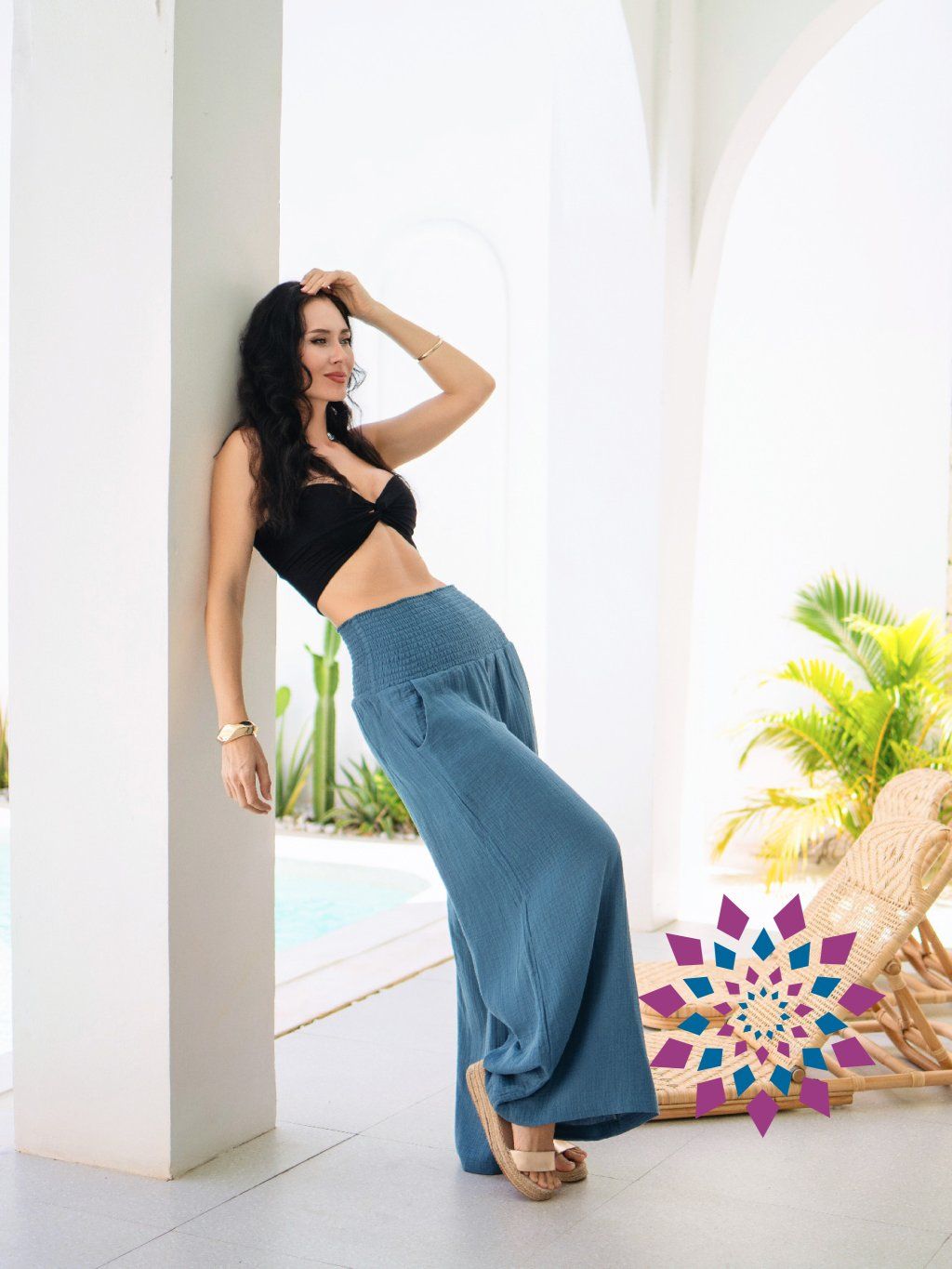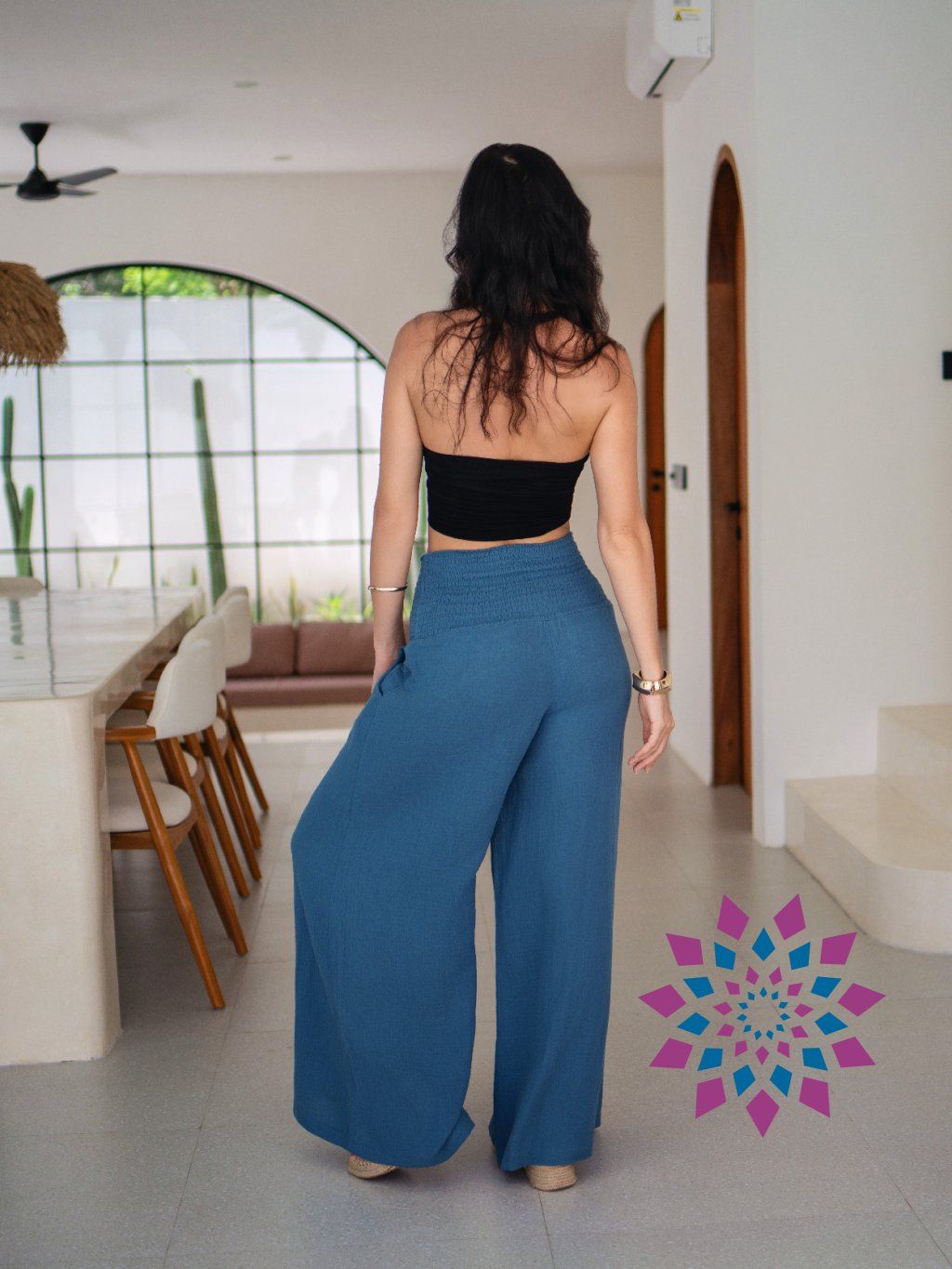 Kalhoty jsou fantasticky volné a přirozeně splynou s postavou. Vysoké řasení v pase se přizpůsobí postavě a drží tam, kde potřebuješ. Široké nohavice dávají prostor v pohybu a nepřekáží ani v horku.