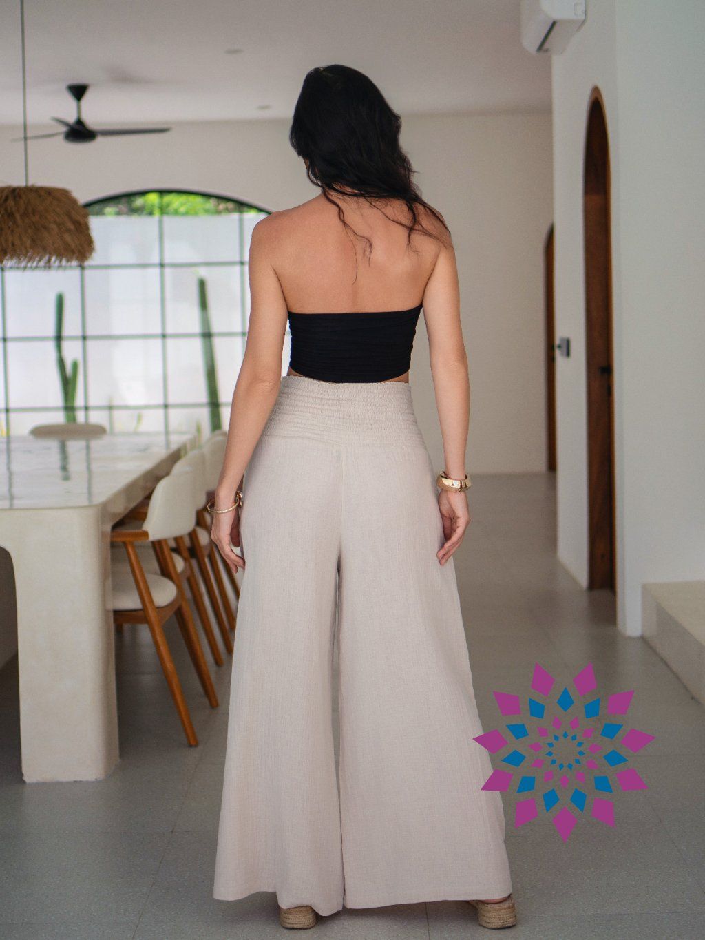 Kalhoty jsou fantasticky volné a přirozeně splynou s postavou. Vysoké řasení v pase se přizpůsobí postavě a drží tam, kde potřebuješ. Široké nohavice dávají prostor v pohybu a nepřekáží ani v horku.