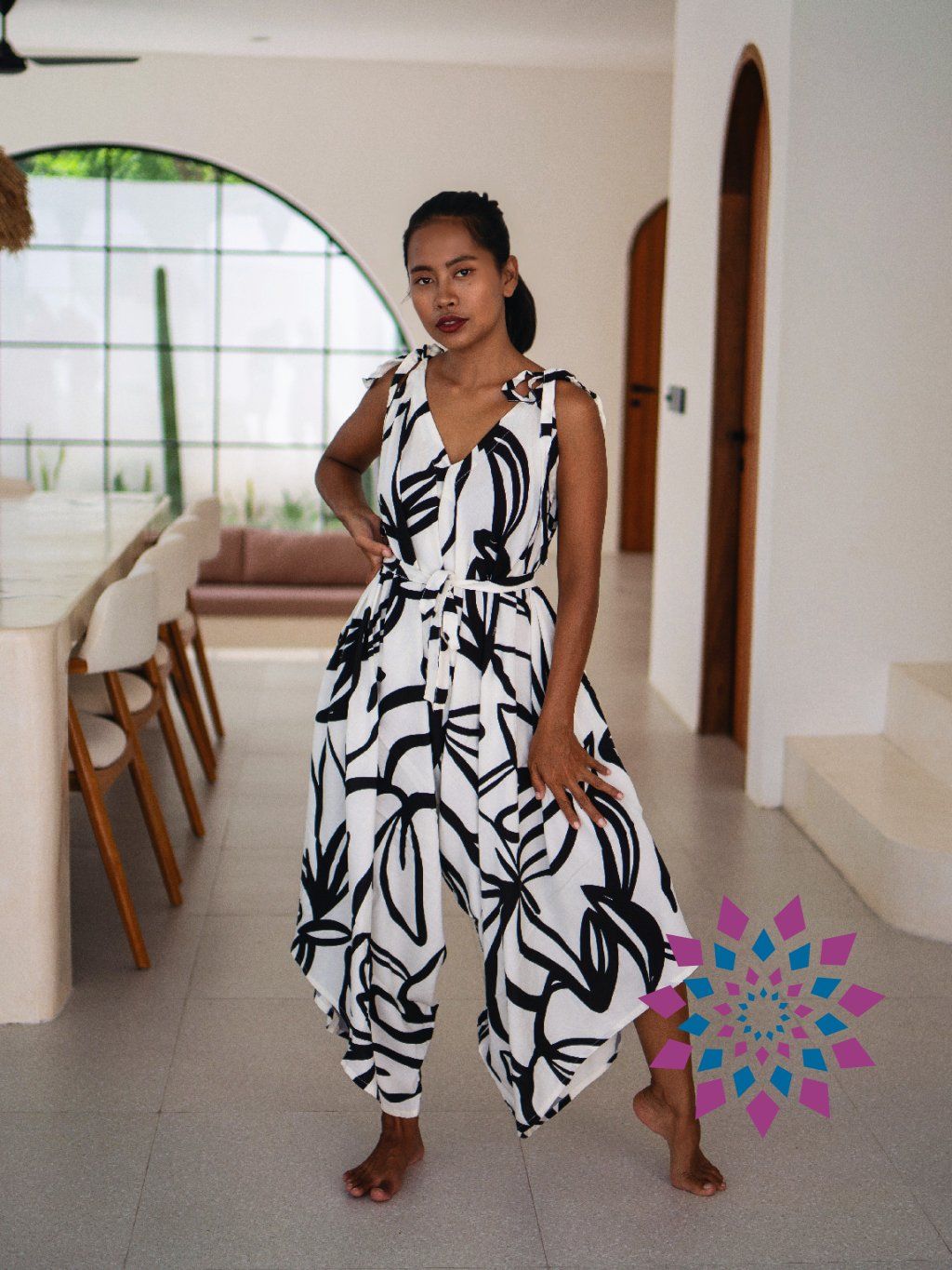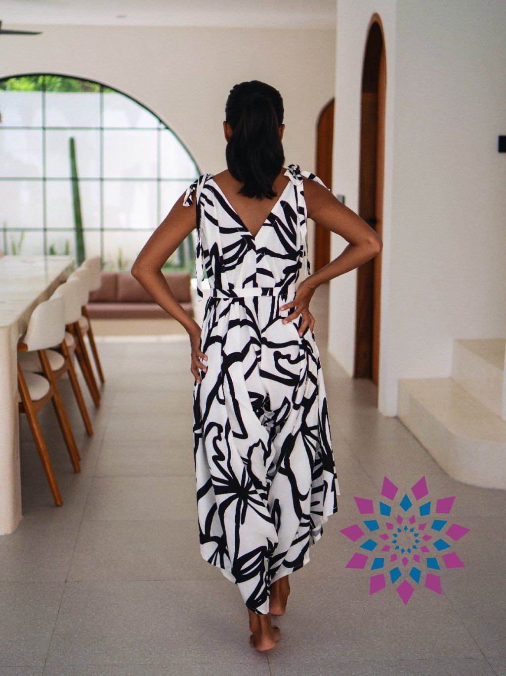 Na těle je vzdušný a nechává prostor pohybu. Při chůzi se volně rozvíjí kolem nohou a nepřekáží. Ramínka si uvážeš podle sebe, stejně tak si nastavíš i pas, takže sedí přesně tak, jak chceš. Výstřih si můžeš upravit podle nálady. Otevřená záda působí čistě a zvýrazní linii těla.
