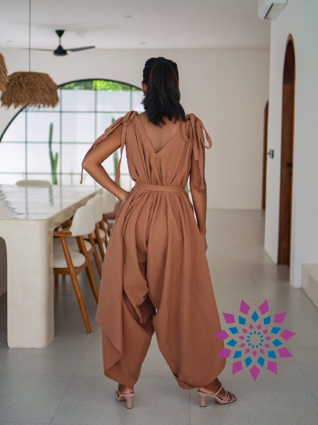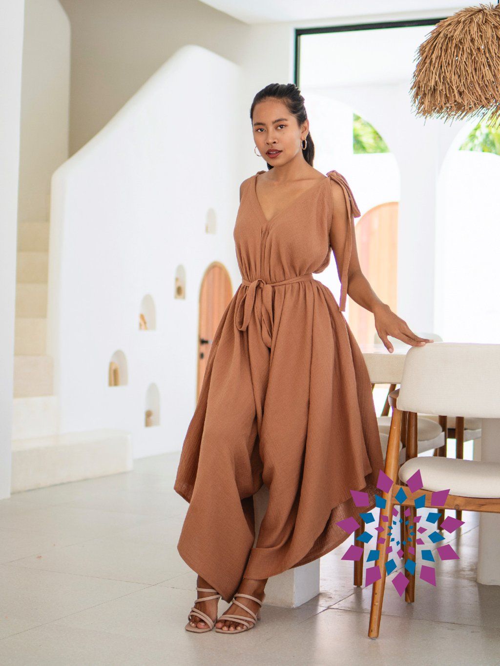 Na těle je vzdušný a nechává prostor pohybu. Při chůzi se volně rozvíjí kolem nohou a nepřekáží. Ramínka si uvážeš podle sebe, stejně tak si nastavíš i pas, takže sedí přesně tak, jak chceš. Výstřih si můžeš upravit podle nálady. Otevřená záda působí čistě a zvýrazní linii těla.