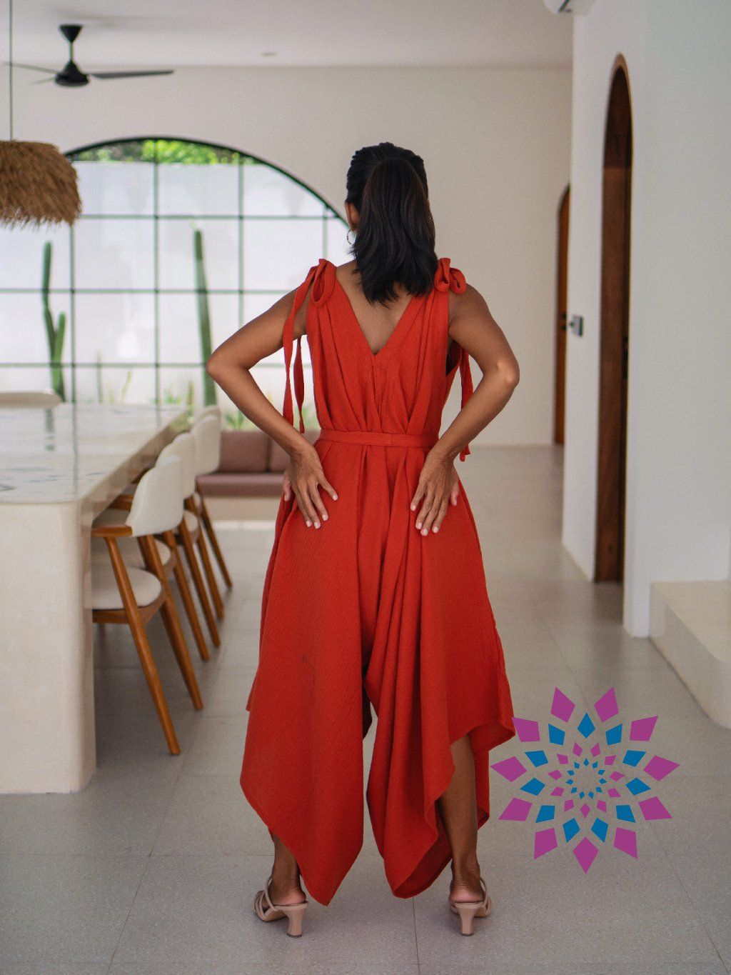 Na těle je vzdušný a nechává prostor pohybu. Při chůzi se volně rozvíjí kolem nohou a nepřekáží. Ramínka si uvážeš podle sebe, stejně tak si nastavíš i pas, takže sedí přesně tak, jak chceš. Výstřih si můžeš upravit podle nálady. Otevřená záda působí čistě a zvýrazní linii těla.