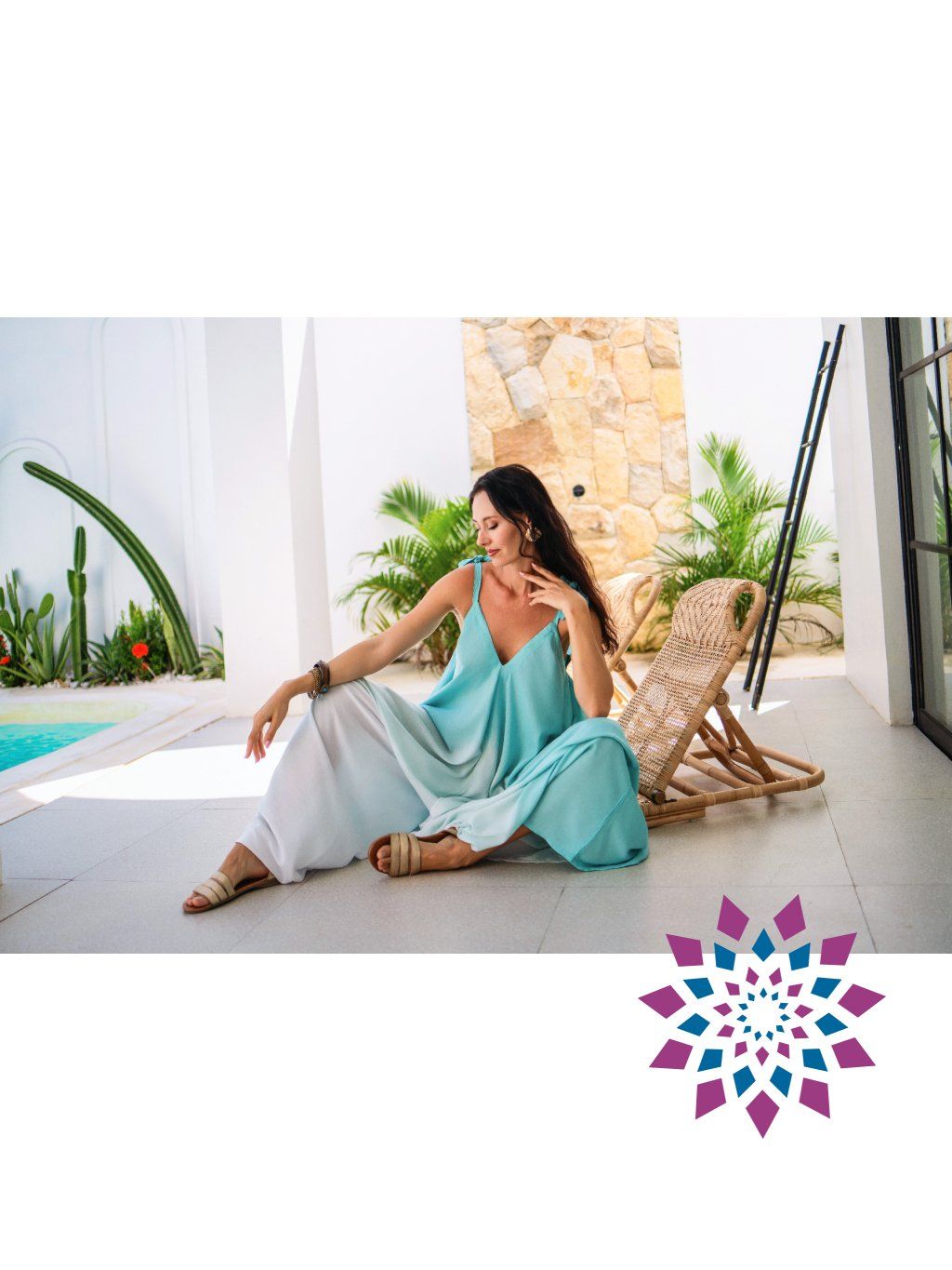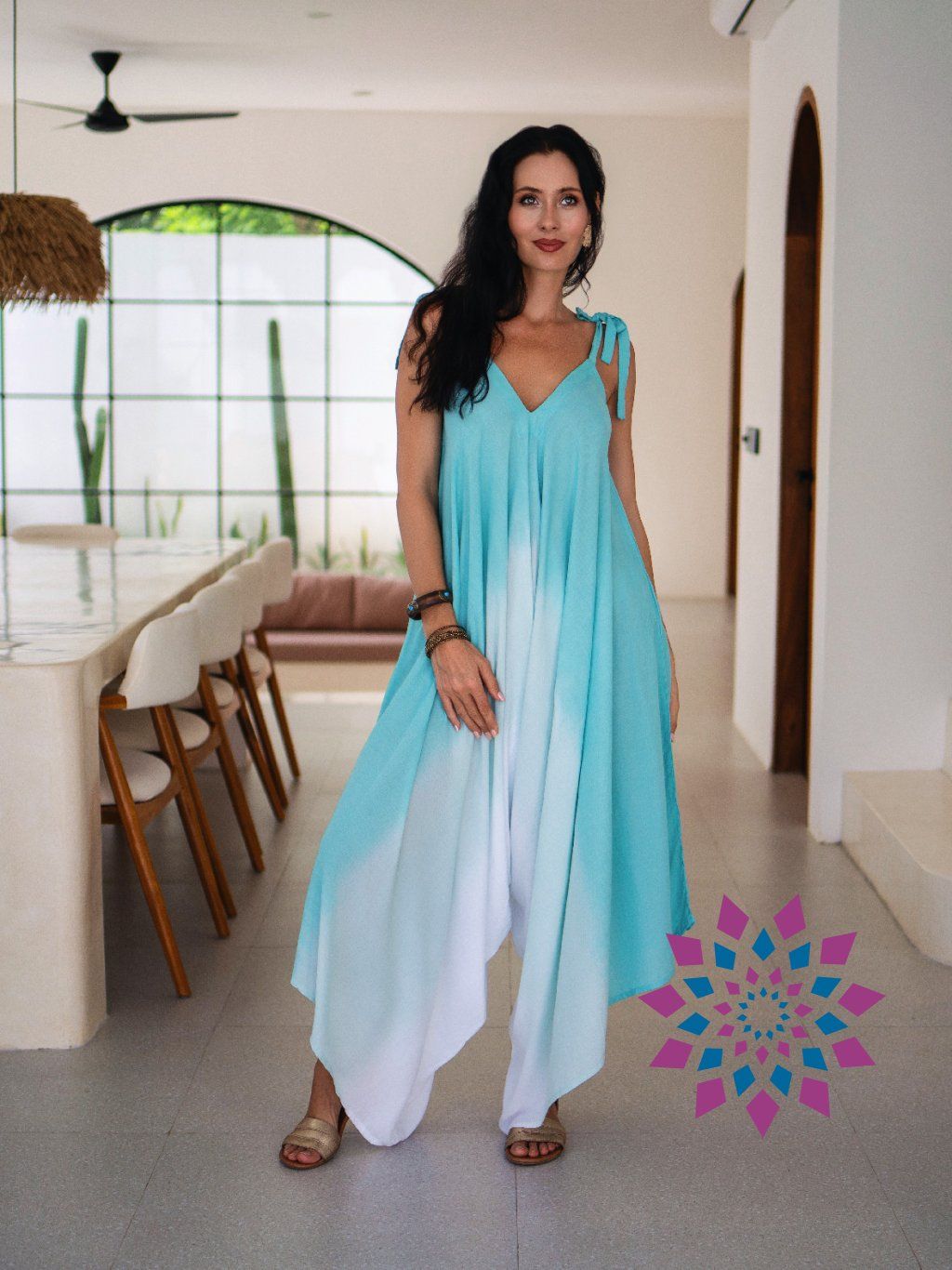 Na těle je vzdušný a nechává prostor pohybu. Při chůzi se volně rozvíjí kolem nohou a nepřekáží. Ramínka si uvážeš podle sebe, stejně tak si nastavíš i pas, takže sedí přesně tak, jak chceš. Výstřih si můžeš upravit podle nálady. Otevřená záda působí čistě a zvýrazní linii těla.