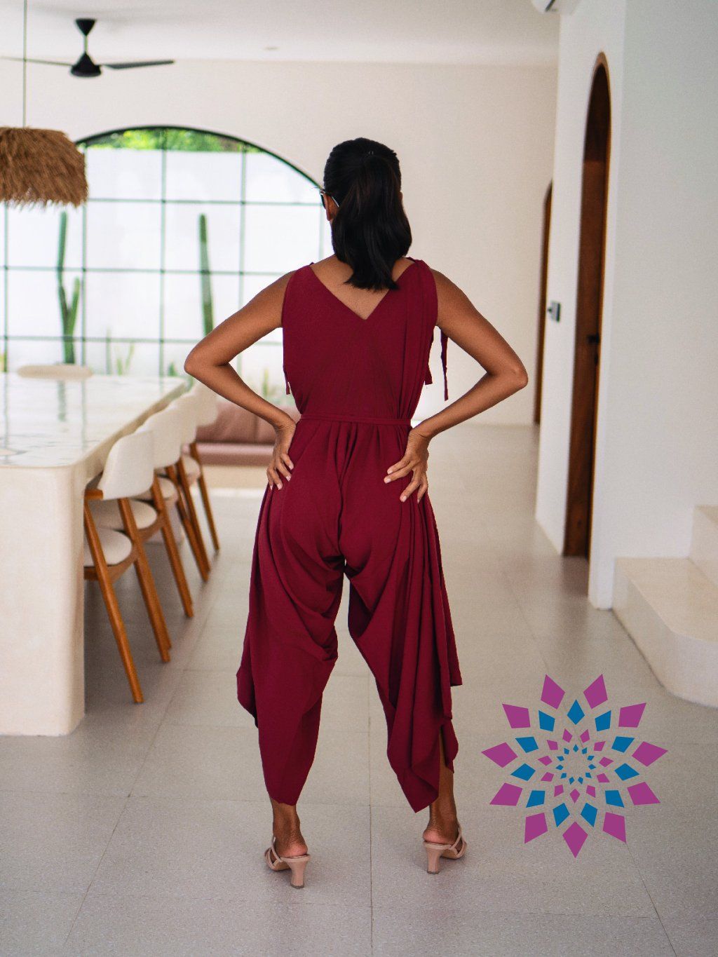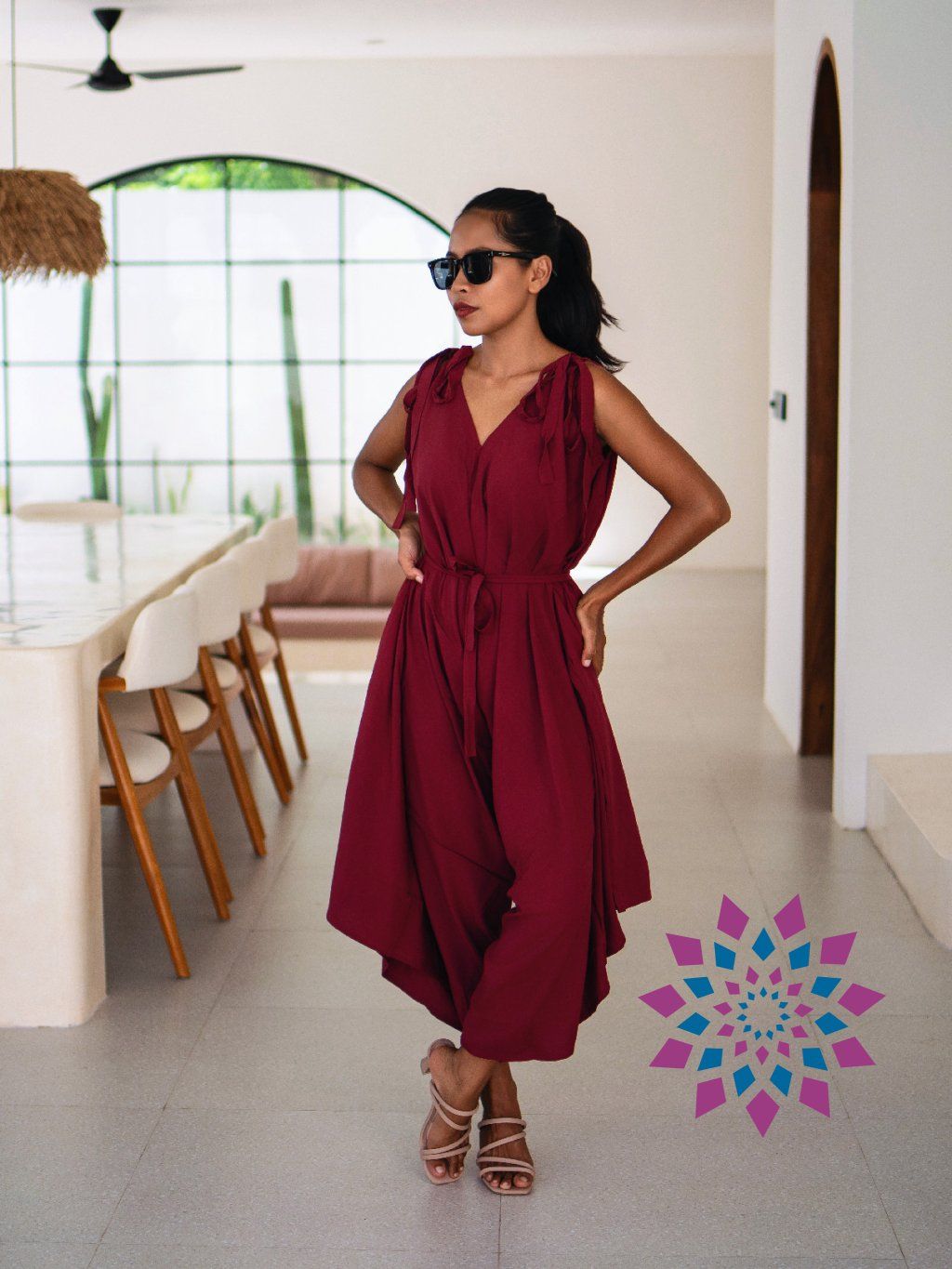 Na těle je vzdušný a nechává prostor pohybu. Při chůzi se volně rozvíjí kolem nohou a nepřekáží. Ramínka si uvážeš podle sebe, stejně tak si nastavíš i pas, takže sedí přesně tak, jak chceš. Výstřih si můžeš upravit podle nálady. Otevřená záda působí čistě a zvýrazní linii těla.