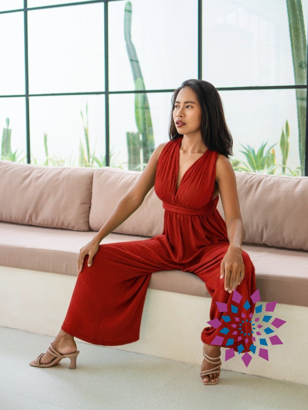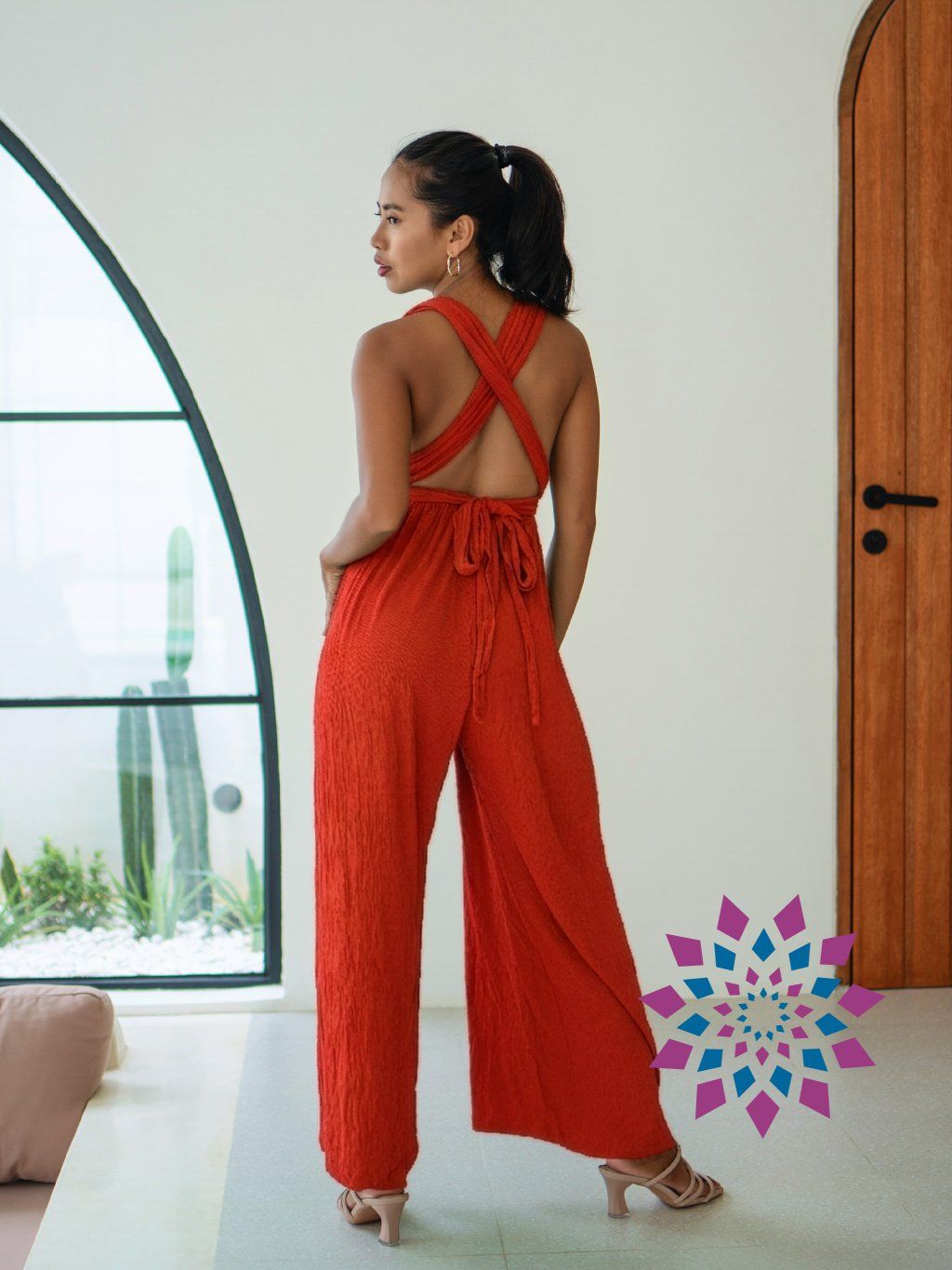Horní část si nastavíš zavázáním za krkem i na zádech, takže drží přesně tak, jak potřebuješ. Výstřih nechá vyniknout linii krku a ramen, záda zůstávají otevřená. V pase je lehké stažení, které vytváří tvar bez omezení. Kalhoty jsou volné, při chůzi drží vzdušnost a nelepí se na tělo.