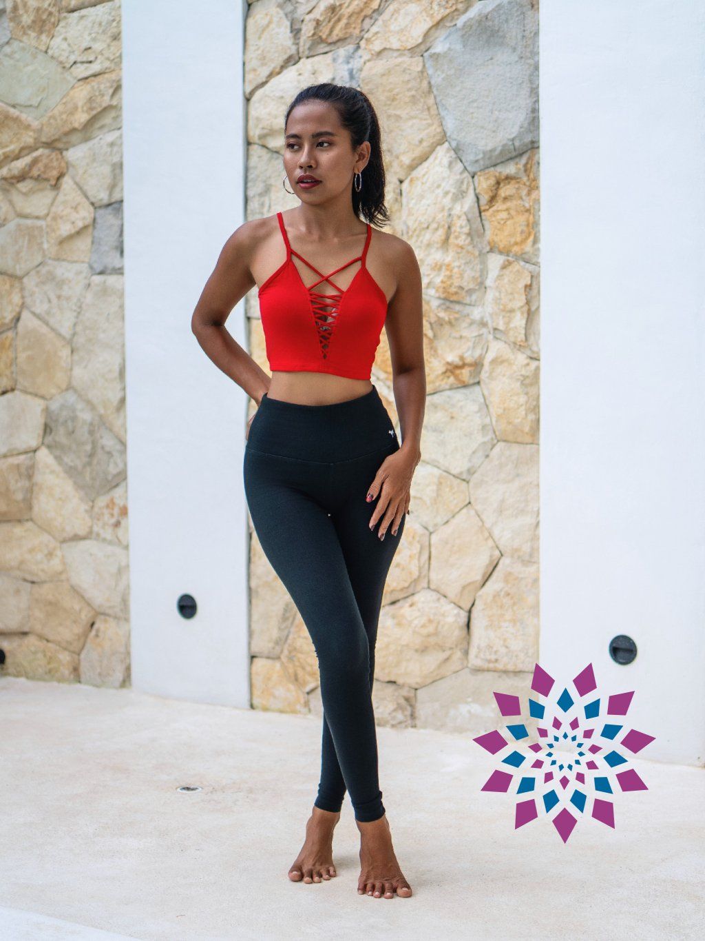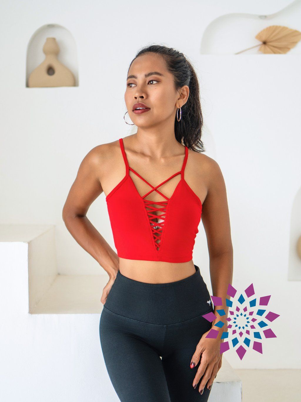 Na těle sedí pevně a přizpůsobí se pohybu bez omezení. Přední šněrování vytváří výrazný detail a zároveň drží vše na svém místě. Střih je delší, takže funguje nejen jako podprsenka, ale i jako krátké tílko.