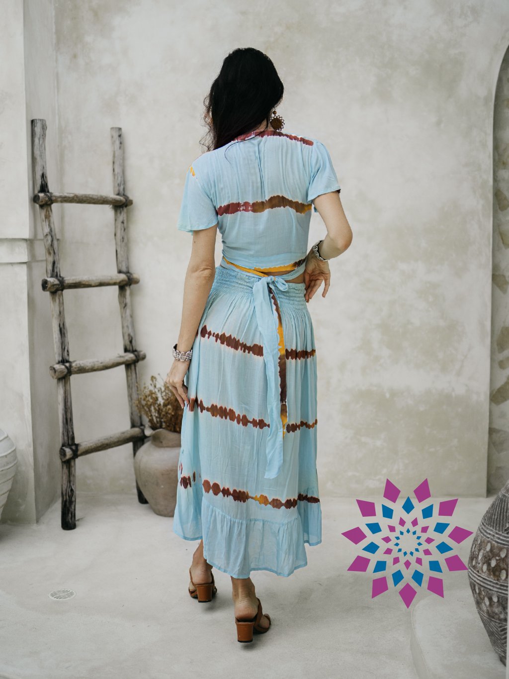 Set HANA šitý ze 100% viskózy I. jakosti z kolekce SECRET Vás naprosto omámí svou jemností materiálu. Set se skládá ze sukně Button, která má širokou, pružnou gumu v pase se šňůrkou a střapci. Zdobí ji knoflíčky a je lemována volánem, který ji dodává nádech španělské elegance. Top Hana s krátkým rukávem lze libovolně vázat pod prsy nebo křížem kolem pasu.