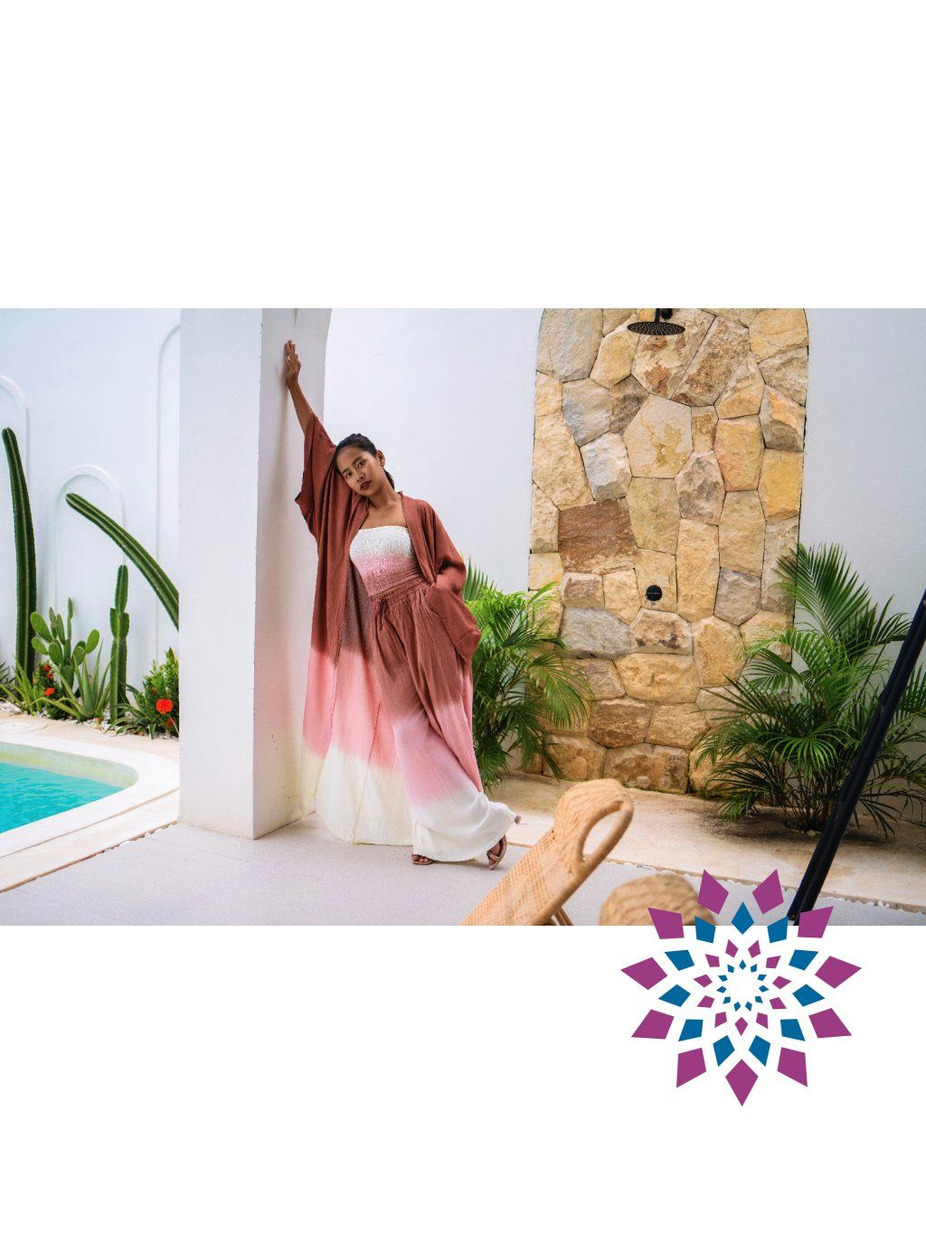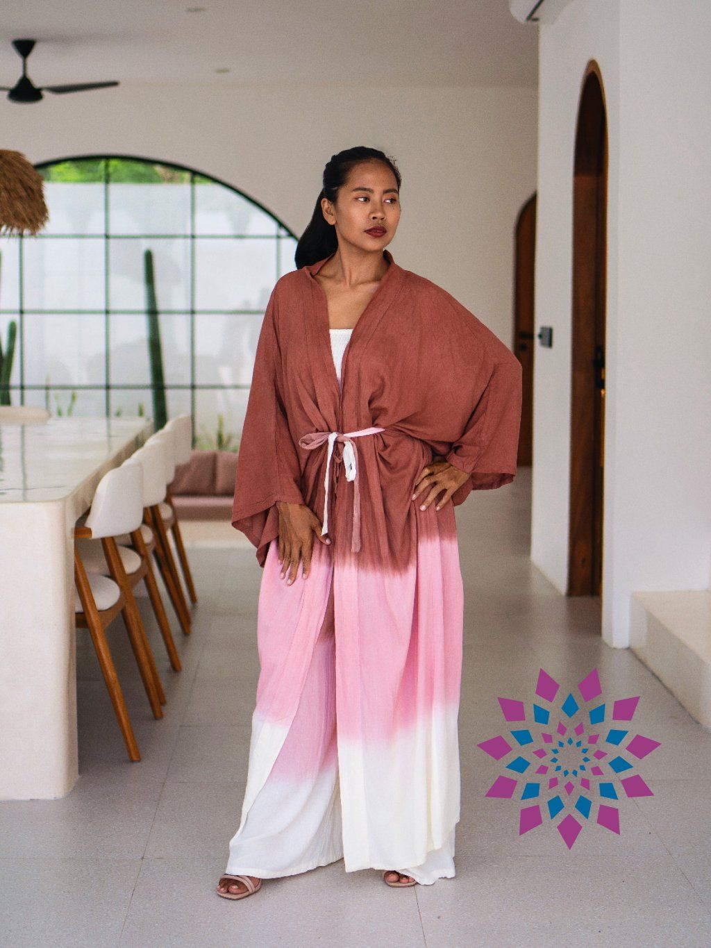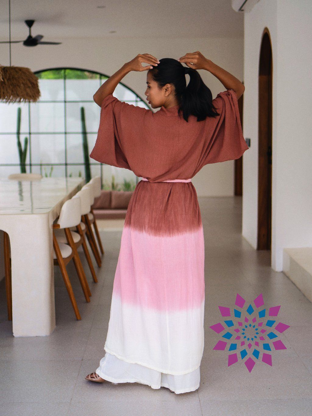 Materiál: 100% viskóza, nejkvalitnější druh viskózy, který svojí jemností připomíná hedvábí. Lehká a prodyšná. Látka je ručně barvená batikou (tie-dye), takže každý kus má trochu jiný přechod barev.