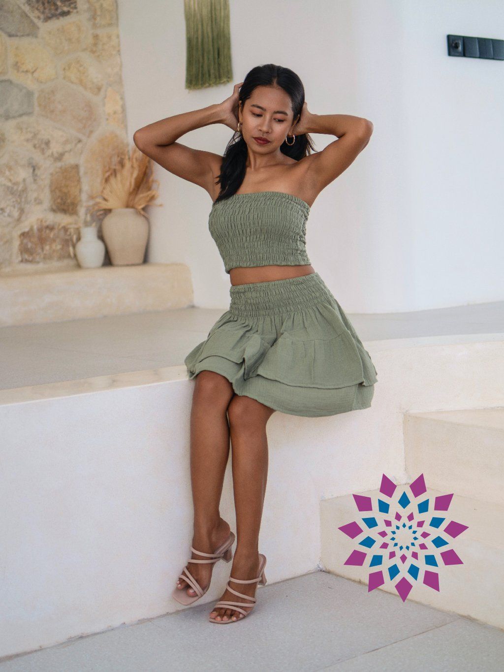 Top a sukně tvoří čistou kombinaci, kterou vezmeš kdykoliv. Drží tvar, působí lehce a na těle je příjemný. Stačí obout sandály a jít. Když chceš změnu, vezmeš každý kousek zvlášť a poskládáš jiný outfit.