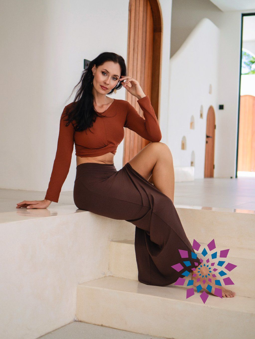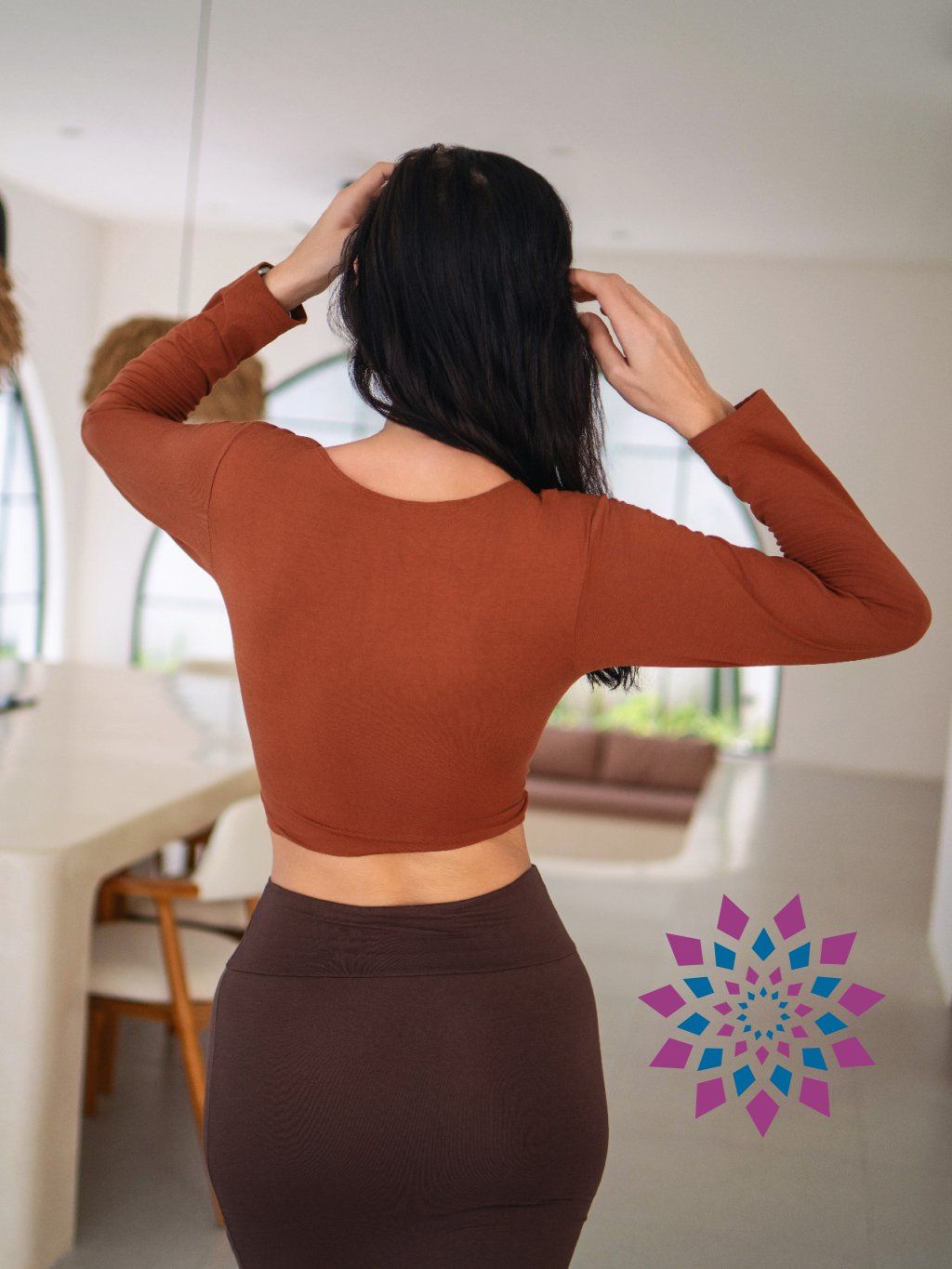 Na těle sedí přiléhavě a přizpůsobí se pohybu bez omezení. Přední křížení vytváří zajímavý detail a jemně tvaruje oblast pasu. Dlouhé rukávy dodávají pocit jistoty a vyváženosti.