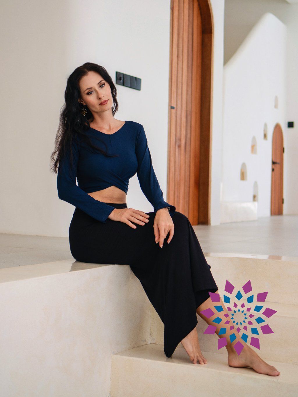 Na těle sedí přiléhavě a přizpůsobí se pohybu bez omezení. Přední křížení vytváří zajímavý detail a jemně tvaruje oblast pasu. Dlouhé rukávy dodávají pocit jistoty a vyváženosti.