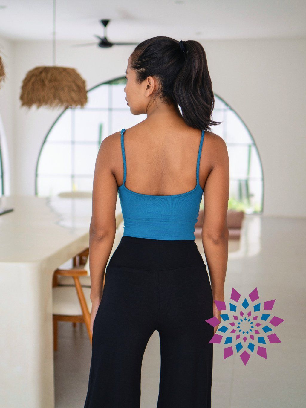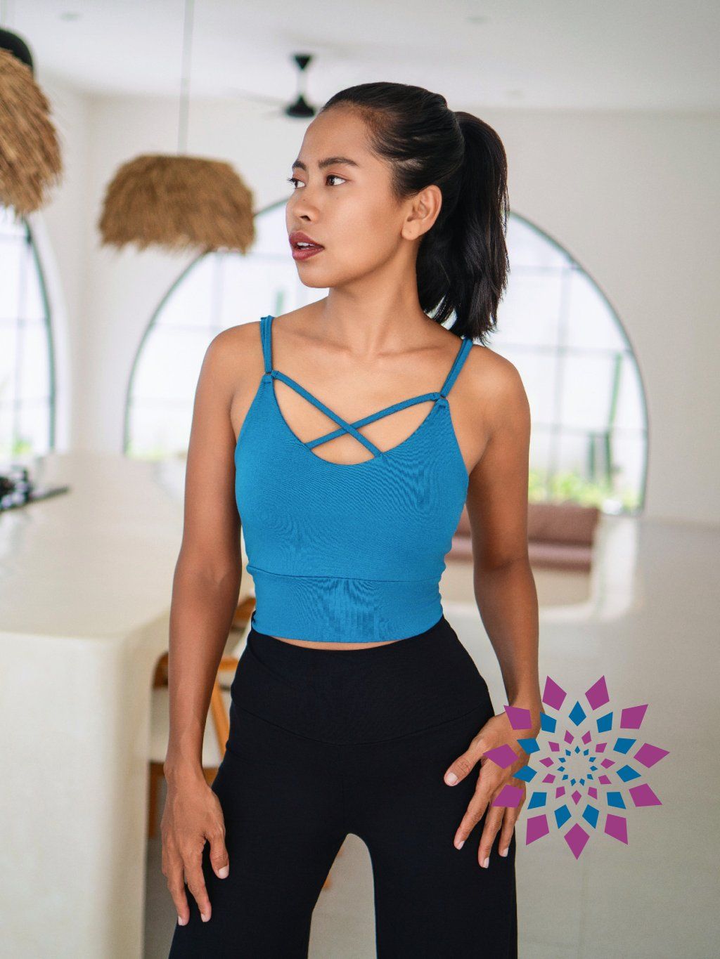 Na těle sedí přirozeně a přizpůsobí se pohybu bez omezení. Nastavitelná ramínka si upravíš podle sebe, takže top sedí přesně tak, jak potřebuješ. Přední překřížení vytváří nenápadný detail, který oživí jinak čistý střih.